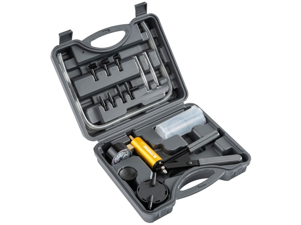 Zařízení je vybaveno nádobou o objemu 120 ml , která umožňuje zachytávání kapalin během testování. Součástí balení je i kompletní příslušenství včetně flexibilních hadic, připojovacích svorek a konektorů , díky čemuž je pumpa univerzálně použitelná pro různé typy vozidel a aplikací.