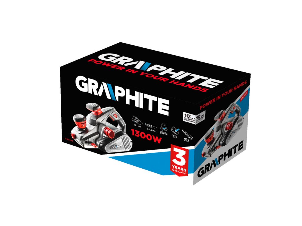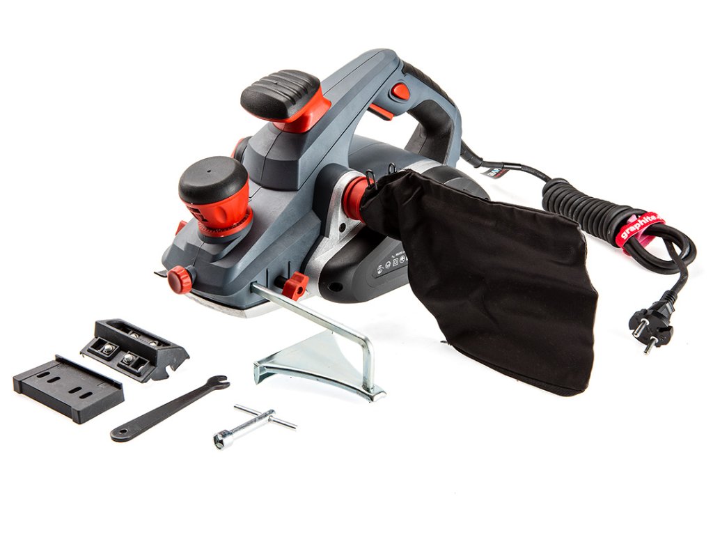 Hoblík 1300 W, hloubka hoblování 0-3.5 mm, otáčky 16000 ot/min, šířka hoblování 110 mm, počet nožů 2 ks, hloubka hoblování 0-14 mm, (DxV) 340 x 195 mm, klíč 5 kg, příslušenství: podpěra, vodítko pro ponorné řezání, nástrčný klíč, zařízení na ostření nožů, adaptér pro odsávání třísky