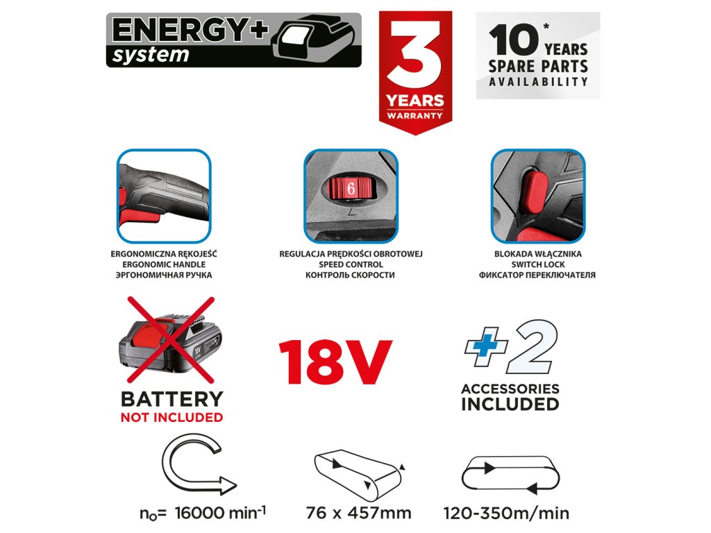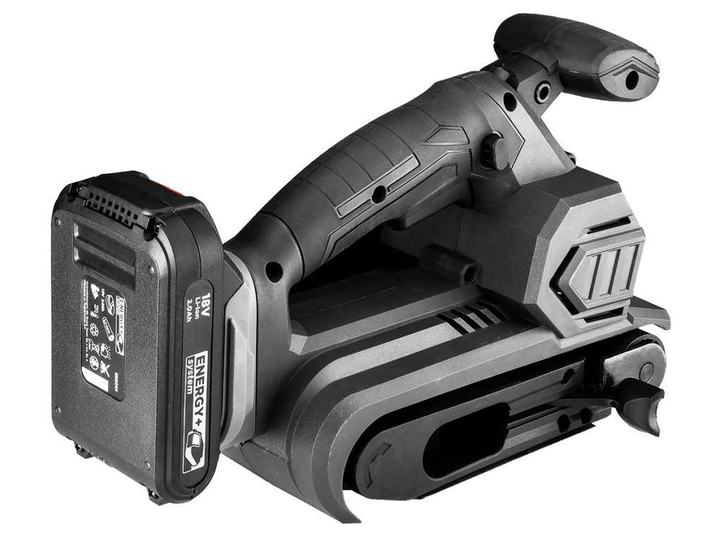 Akumulátorová pásová bruska Energy+ 18 V, rychlost pásu 120-350 m/min, otáčky 16000 min-1, brusná plocha 76 x 120 mm, velikost pásu 76 x 457 mm. Příslušenství: sáček na prach, nekonečný pás, Hmotnost 2,38 kg.