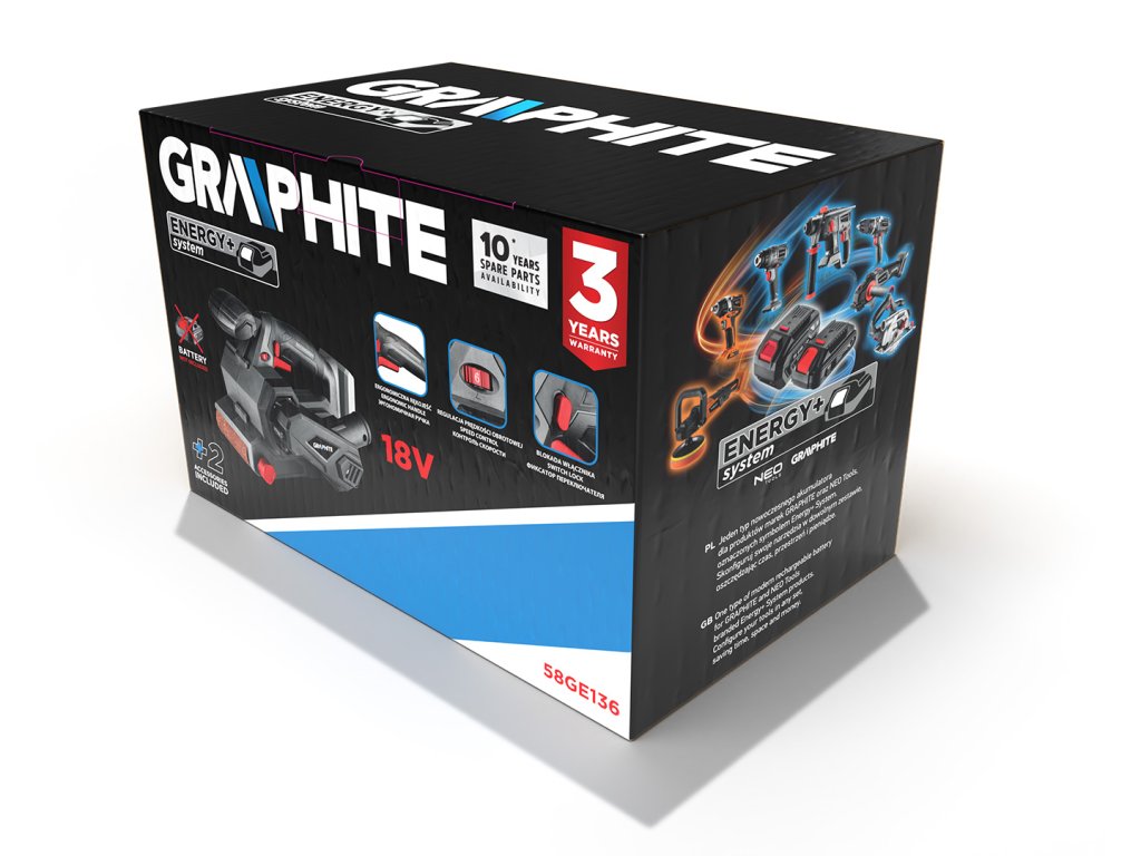 Akumulátorová pásová bruska Energy+ 18 V 58GE136 od společnosti GRAPHITE dosahuje rychlosti pohybu pásu 120-350 m/min. Otáčky jsou 16 000 min-1. Bruska funguje na akumulátorovém systému Energy+ a je kompatibilní s 18 V lithium-iontovými akumulátory GRAPHITE. Přístroj má brusnou plochu 76 x 120 mm a velikost brusného pásu 76 x 457 mm. Nabízí se s kapsou na prach a nekonečným řemenem. Bruska váží jen 2,38 kg. Dobře poslouží jak v profesionálních dílnách, tak při rozsáhlém použití v domácnosti.