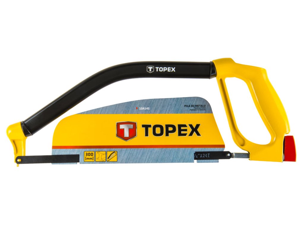 Pila na kov TOPEX (ref. 10A145) s délkou čepele 300 mm. Inovativní 3D systém použitý v pile umožňuje otáčení pilového kotouče a řezání prvků na obtížně přístupných místech. Ergonomická rukojeť je vhodně profilovaná, což umožňuje přesné vedení a zajišťuje vysoký komfort práce. Značka TOPEX je určena pro domácí kutily.
