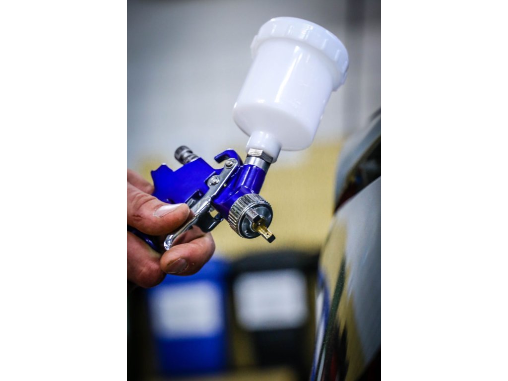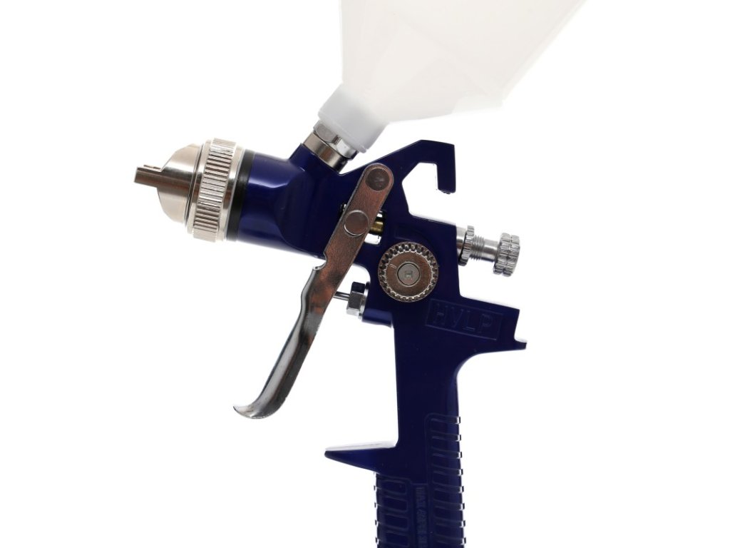 - Pistola vyrobená technologií HVLP – přizpůsobená nižšímu tlaku, což umožňuje úsporu až 30 % laku.