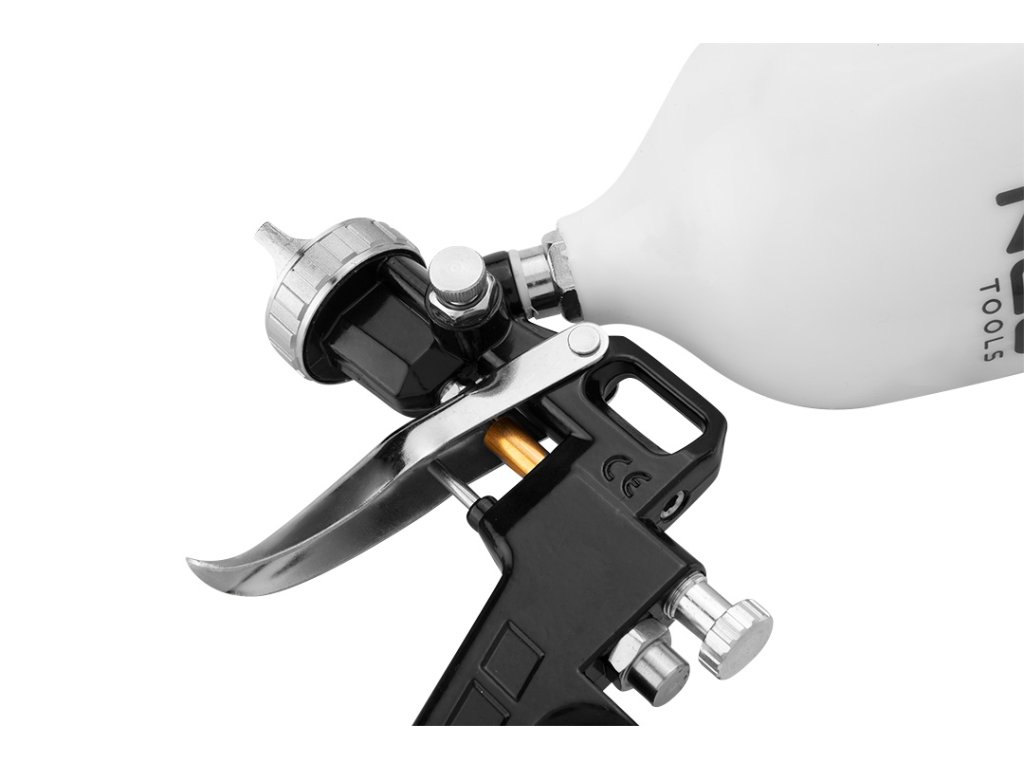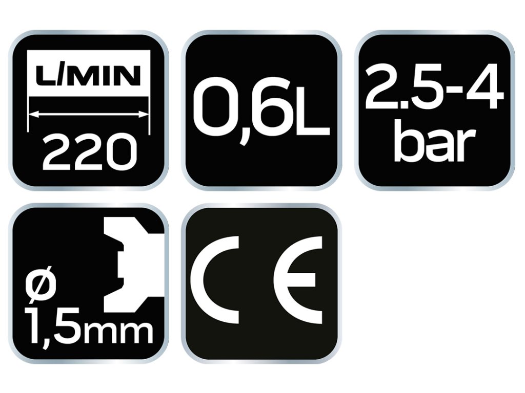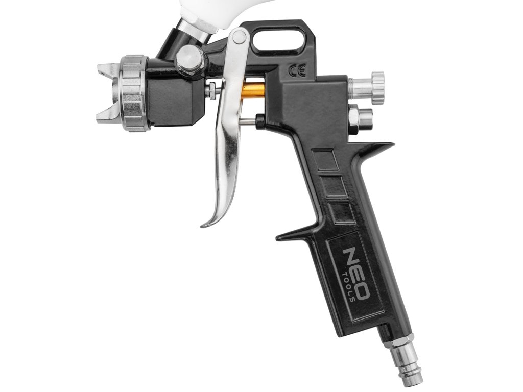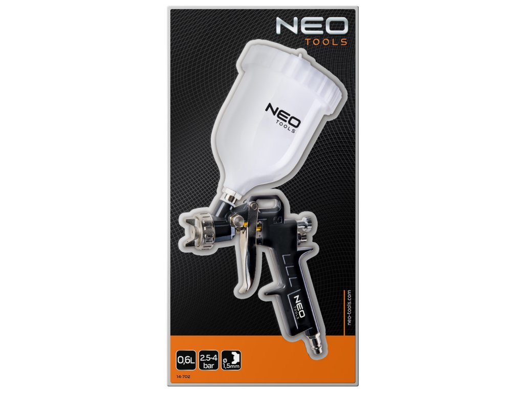 stříkací pistole NEO s plastovou horní nádobou o objemu 0,6l. Nerezová tryska o průměru 1,5 mm. Zajišťuje efektivní a přesnou práci. Pracovní tlak do 4 barů. Certifikát CE zaručuje soulad s evropskými bezpečnostními normami.