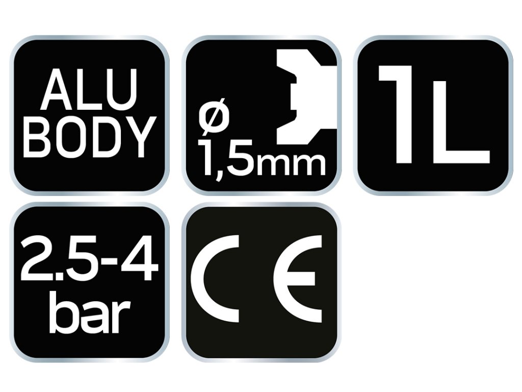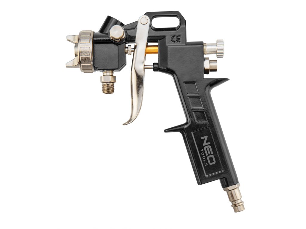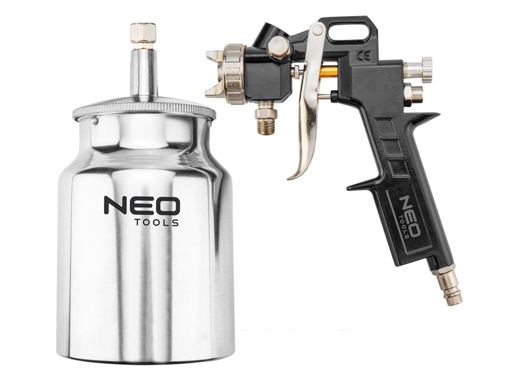 stříkací pistole NEO se spodní ocelovou nádobou o objemu 1l. Má trysku z nerezavějící oceli o průměru 1,5 mm. Zajišťuje efektivní a přesnou práci. Pracovní tlak do 4 barů. Certifikát CE zaručuje soulad s evropskými bezpečnostními normami.