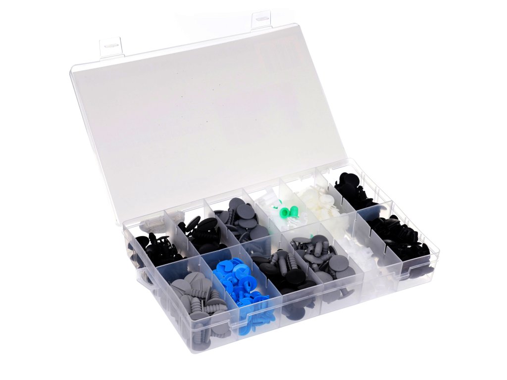 Sada plastových spon pro automobily značky FIAT Balení obsahuje 12 typů spon, celkem 308 spon. Celek je zabalen v krabici s praktickými přihrádkami.