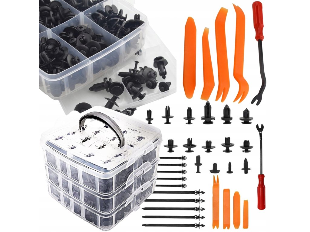 Sada kolíků pro upevnění, 845 kusů, je praktický a všestranný set určený k upevnění karoserie, čalounění, blatníků, nárazníků a potahů v různých typech automobilů.