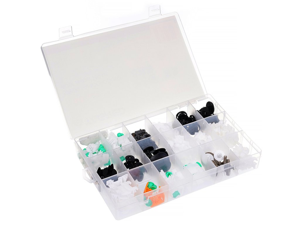 Sada plastových spon pro automobily značky AUDI. Balení obsahuje 12 typů spon, celkem 160 spon. Celek je zabalen v krabici s praktickými přihrádkami.
