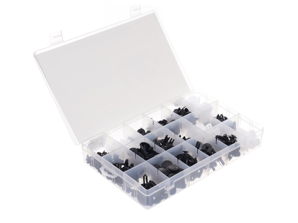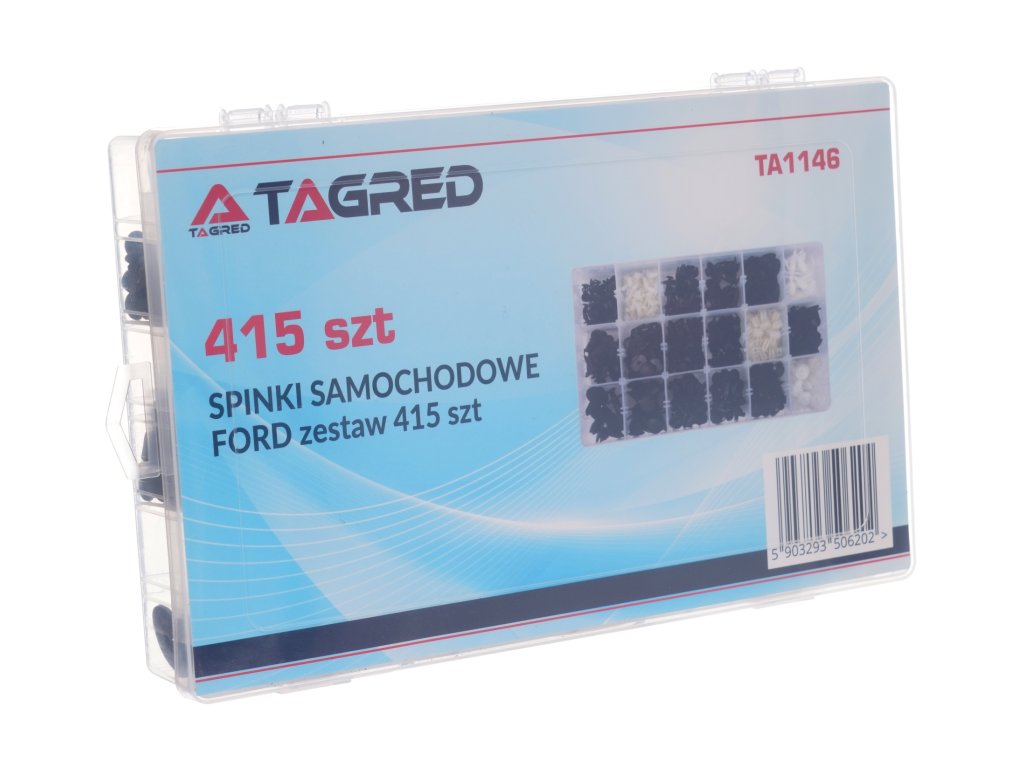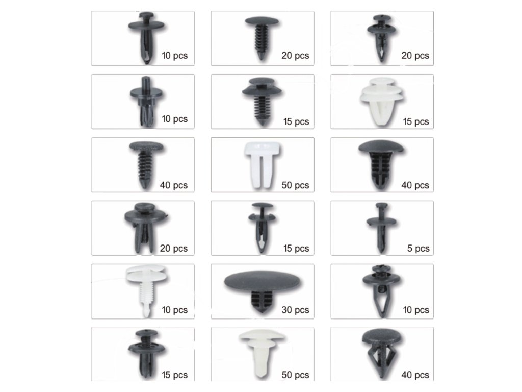 Sada plastových spon pro automobily značky FORD. Balení obsahuje 18 typů spon, celkem 415 spon. Celek je zabalen v krabici s praktickými přihrádkami.
