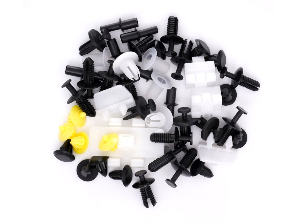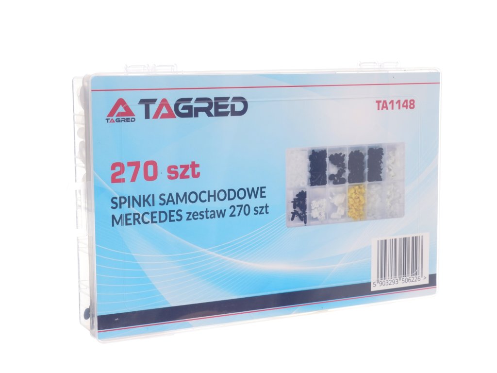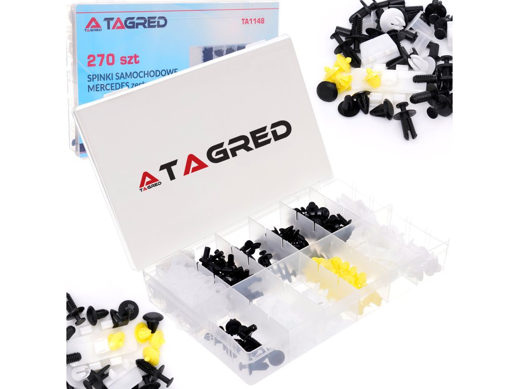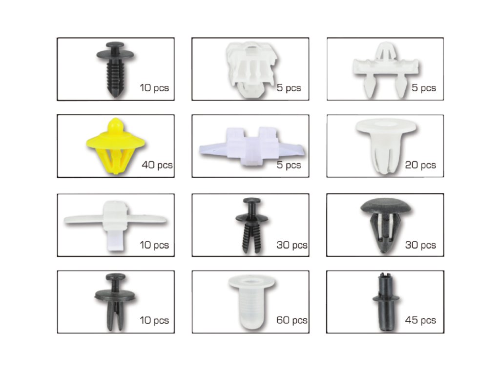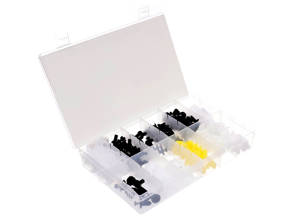 Sada plastových spon pro automobily značky MERCEDES. Balení obsahuje 12 typů spon, celkem 270 spon. Celek je zabalen v krabici s praktickými přihrádkami.