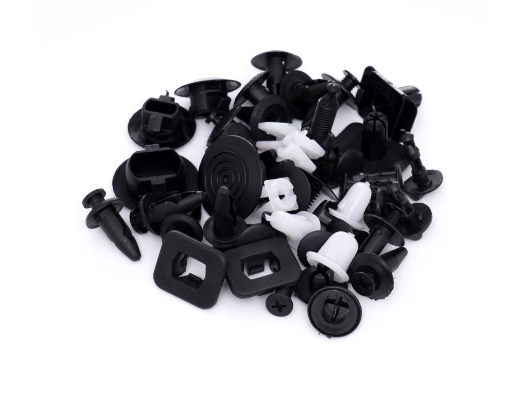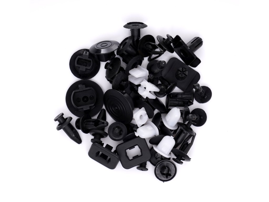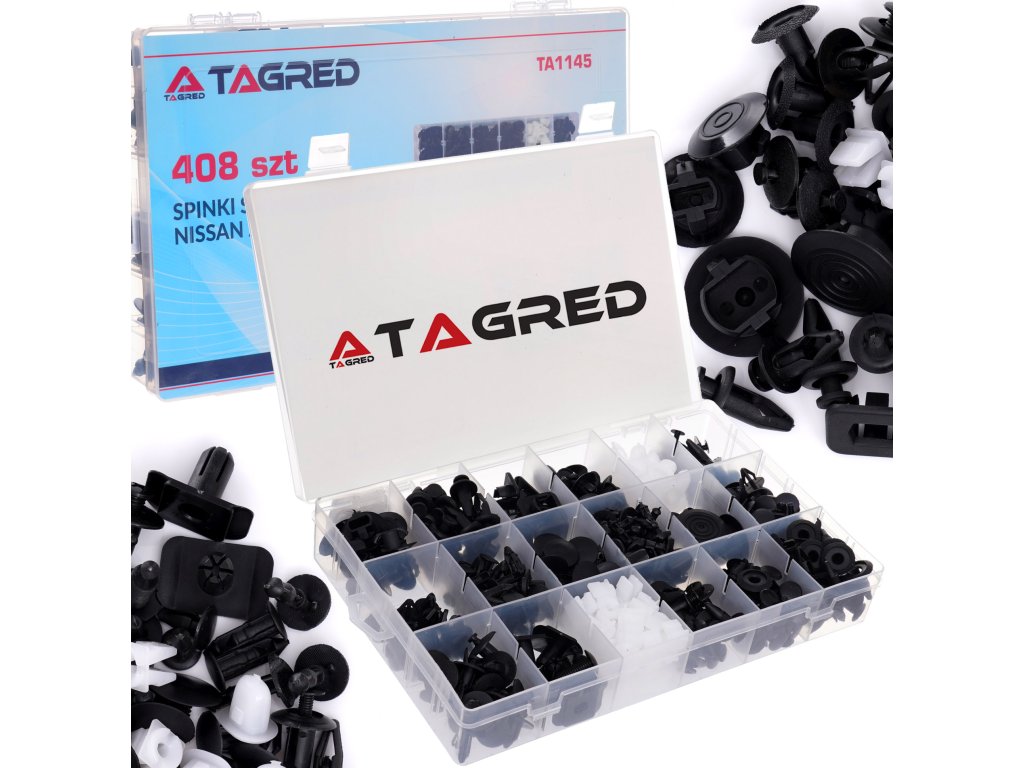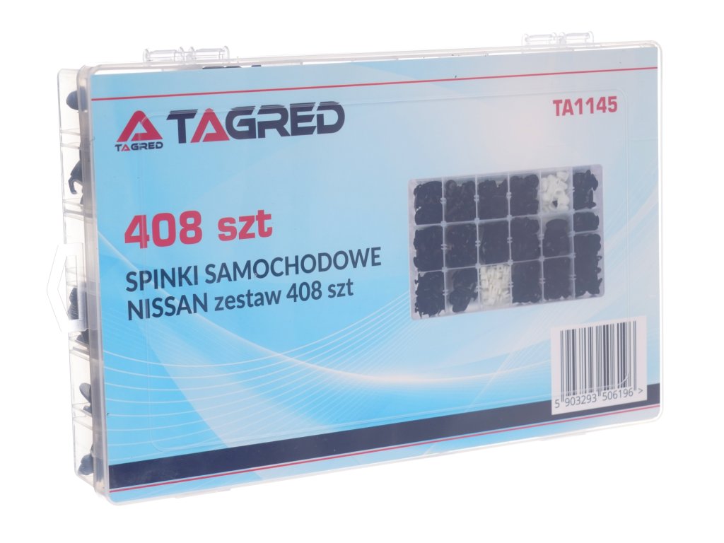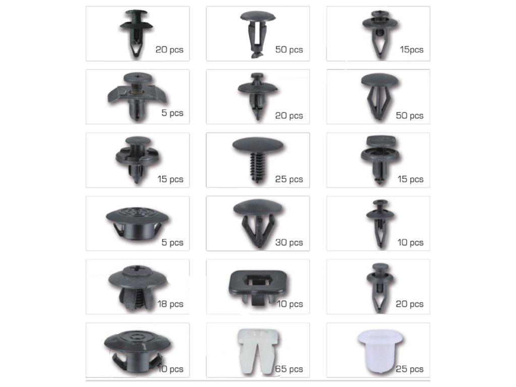 Sada plastových spon pro automobily značky NISSAN. Balení obsahuje 18 typů spon, celkem 408 spon. Celek je zabalen v krabici s praktickými přihrádkami.
