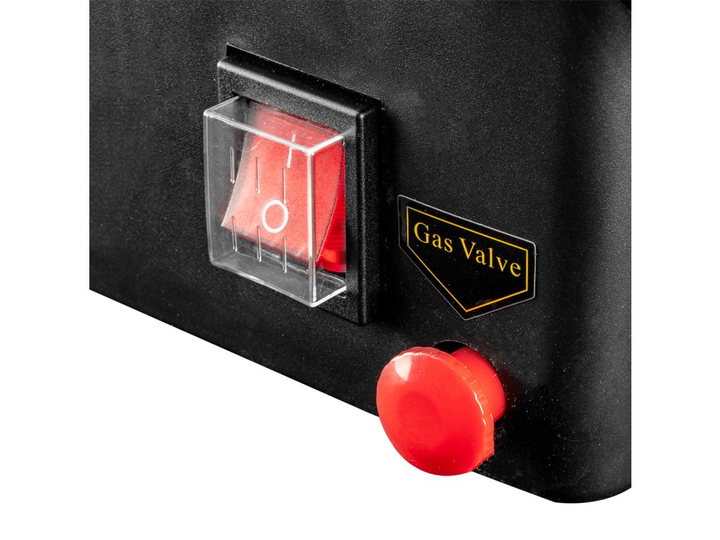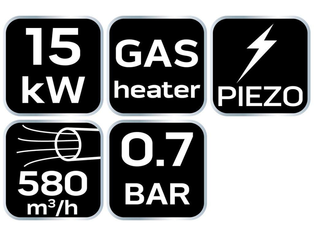 Plynový ohřívač 15 kW, tlak 0,7 bar, spotřeba paliva 1,09 kg/h, průtok vzduchu 580 m³/h, regulátor tlaku, hadice 1,5 m, piezoelektrické zapalování.