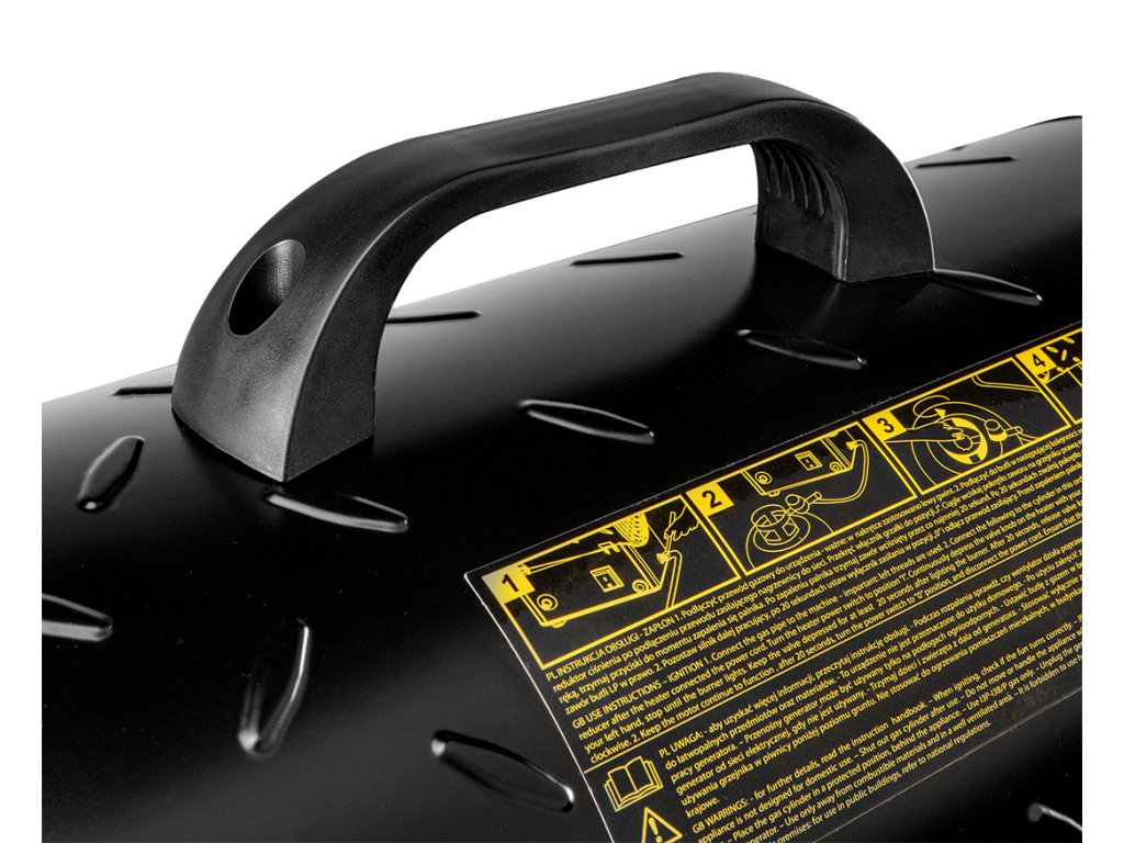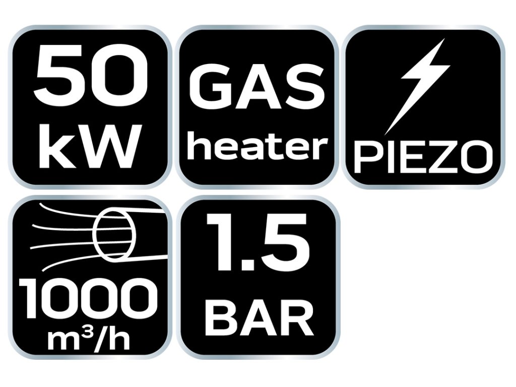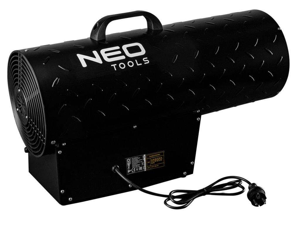 Plynový ohřívač NEO (ref. 90-085) s piezoelektrickým zapalováním a výkonem 50 kW je přenosný zdroj tepla, který je určen k vytápění prostor, jako jsou haly, sklady, staveniště. Zařízení má ochranu proti přehřátí a úniku plynu. Ohřívač je poháněn propan-butanem. Průtok vzduchu je 1000 m? za hodinu. Sada obsahuje redukci tlaku a 1,5 m dlouhou hadici.