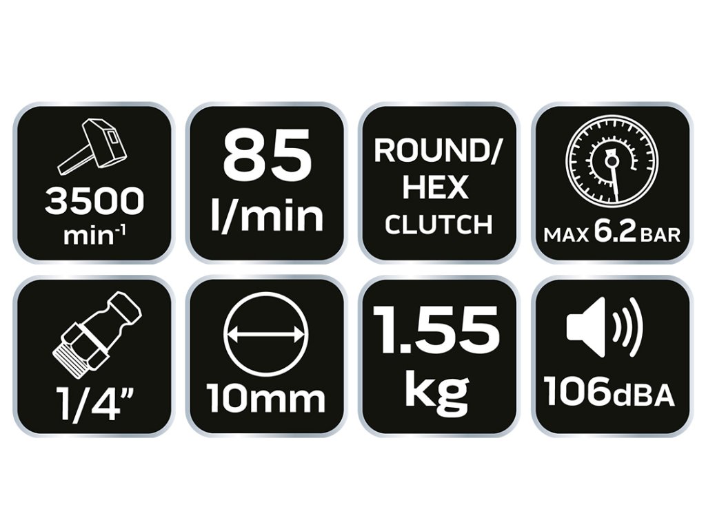 Pneumatické nárazové kladivo NEO se vyznačuje kompaktním designem, který umožňuje pracovat v obtížně přístupných místech. Má vzduchový konektor 1/4". Nástroj s univerzálním použitím v dílně při klempířských pracích na stavbě, při výkovku nebo odkování. Obsahuje: dláta 5 ks: ploché 20 mm, ploché s drážkou 20 mm, zahnuté 22 mm, trojúhelníkový řez 20 mm, hrot 2 mm, hrot 2 mm, hrot 2 mm (prázdná) 1 ks, pružina pro upevnění kladiva 1 ks. Osvědčení CE potvrzuje vysokou kvalitu výrobku. Značka NEO splňuje očekávání odborníků.