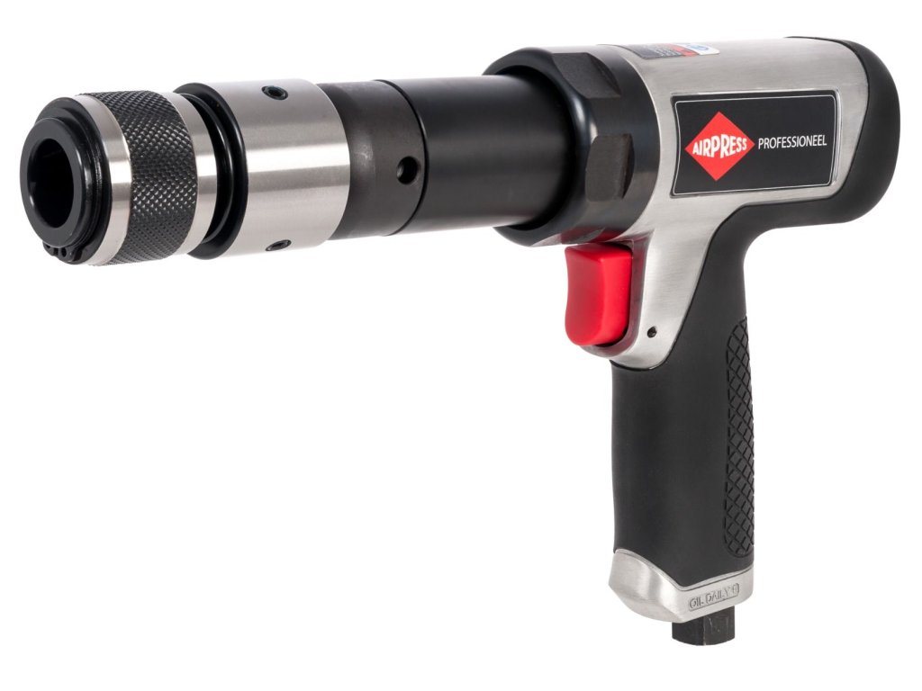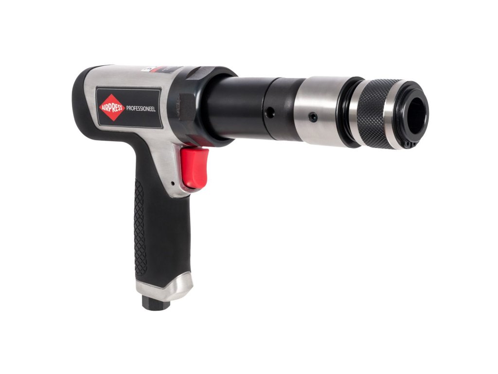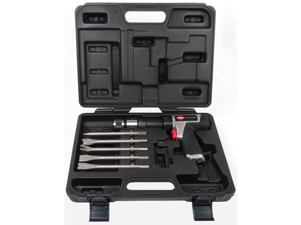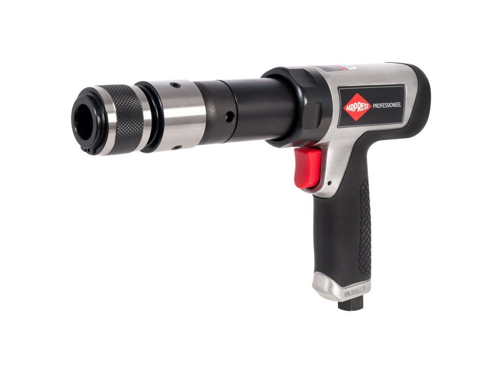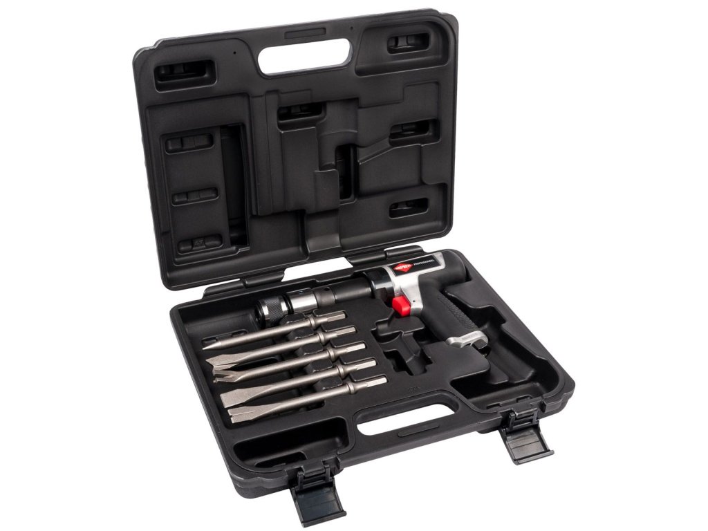Úderový kladivo 45487 Airpress s hexagonálním úchopem 10,2 mm. Pevná ocelová konstrukce s antivibračním a protiskluzovým povrchem typu „softgrip“ výrazně zvyšuje komfort práce. Použitý dvojitý systém tlumení vibrací chrání obsluhu před negativními následky vibrací. 2500 úderů za minutu mechanismu úderu a energie úderu na úrovni 9,5 J činí toto kladivo mimořádně účinným. Víceportový odvod vzduchu v přední části odvádí od obsluhy vzduch, nečistoty a odpad. Standardně dodáváno s odolným kufrem, rychle vyměnitelným úchopem nástroje a 5 dlátami. Inovativní systém výměny úchopu rychle umožňuje přestavbu zařízení na jehlové kladivo pro odstraňování rzi. Doporučuje se pro stavební a demoliční práce, jakož i při odstraňování rzi, tvrdých usazenin nebo čištění nádrží.