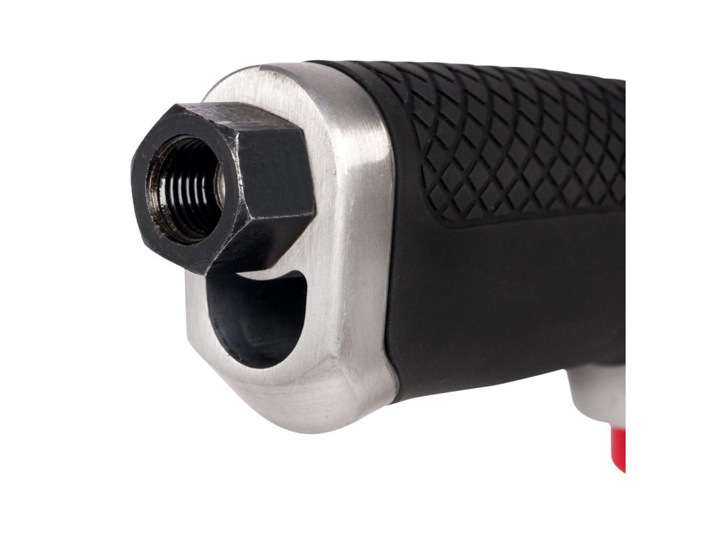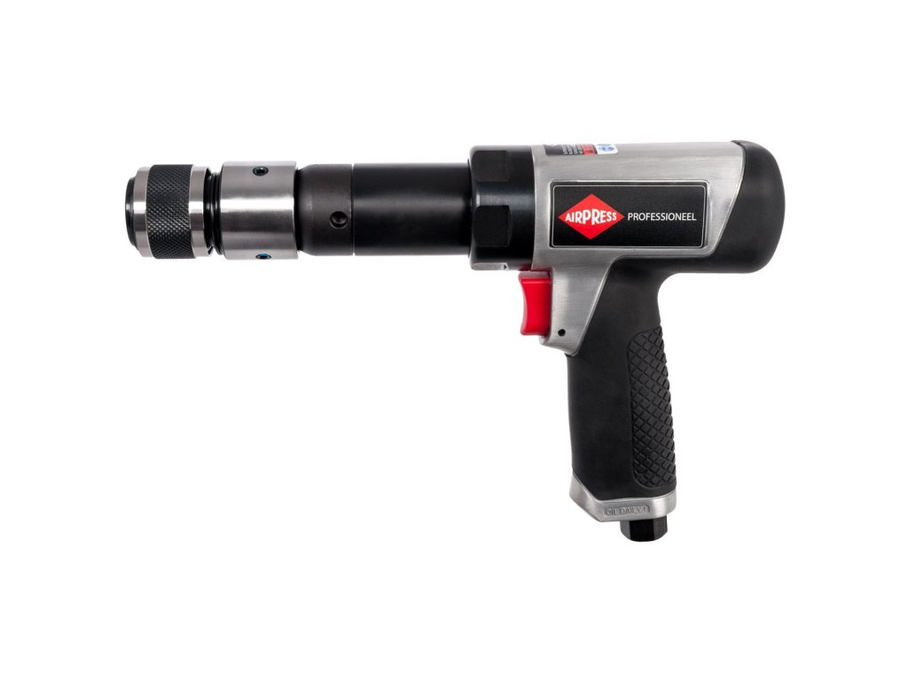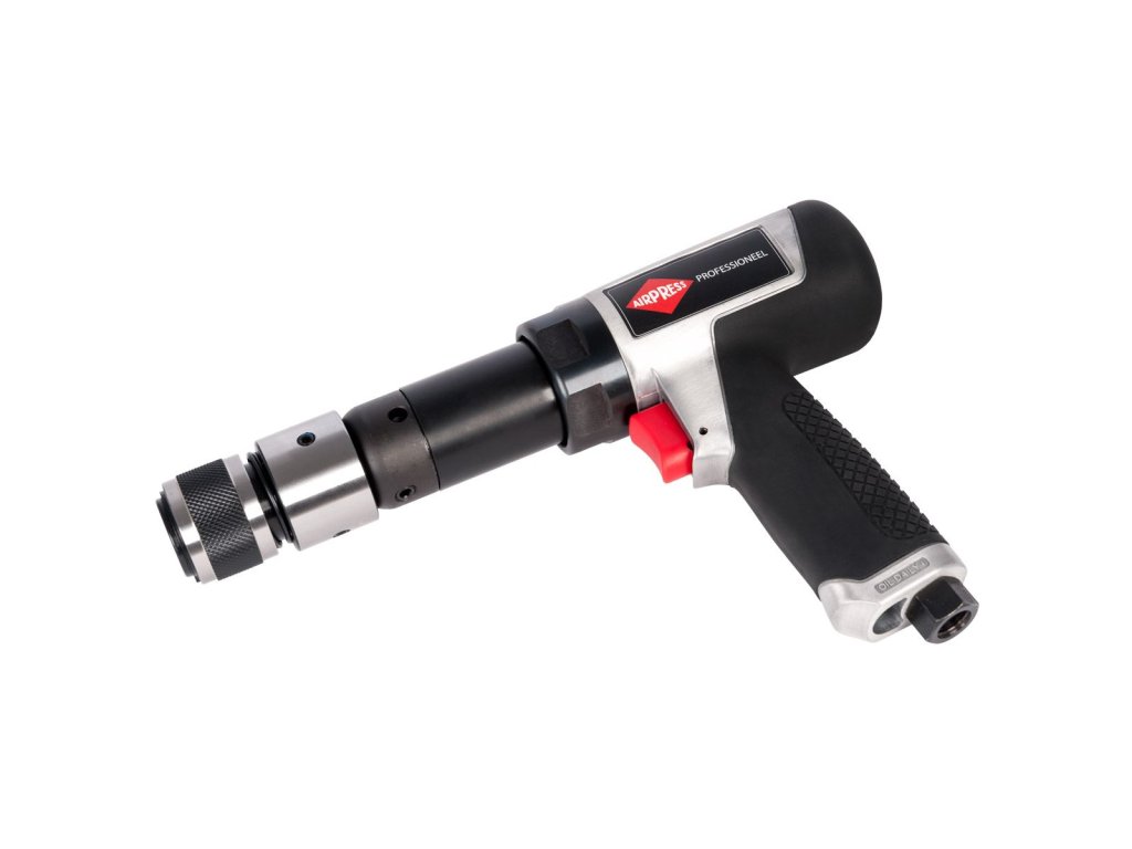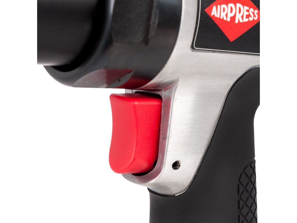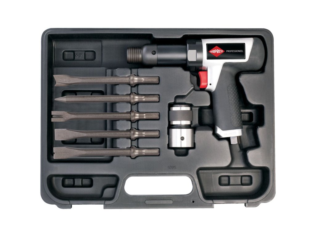 Úderový kladivo 45487 Airpress s hexagonálním úchopem 10,2 mm. Pevná ocelová konstrukce s antivibračním a protiskluzovým povrchem typu „softgrip“ výrazně zvyšuje komfort práce. Použitý dvojitý systém tlumení vibrací chrání obsluhu před negativními následky vibrací. 2500 úderů za minutu mechanismu úderu a energie úderu na úrovni 9,5 J činí toto kladivo mimořádně účinným. Víceportový odvod vzduchu v přední části odvádí od obsluhy vzduch, nečistoty a odpad. Standardně dodáváno s odolným kufrem, rychle vyměnitelným úchopem nástroje a 5 dlátami. Inovativní systém výměny úchopu rychle umožňuje přestavbu zařízení na jehlové kladivo pro odstraňování rzi. Doporučuje se pro stavební a demoliční práce, jakož i při odstraňování rzi, tvrdých usazenin nebo čištění nádrží.