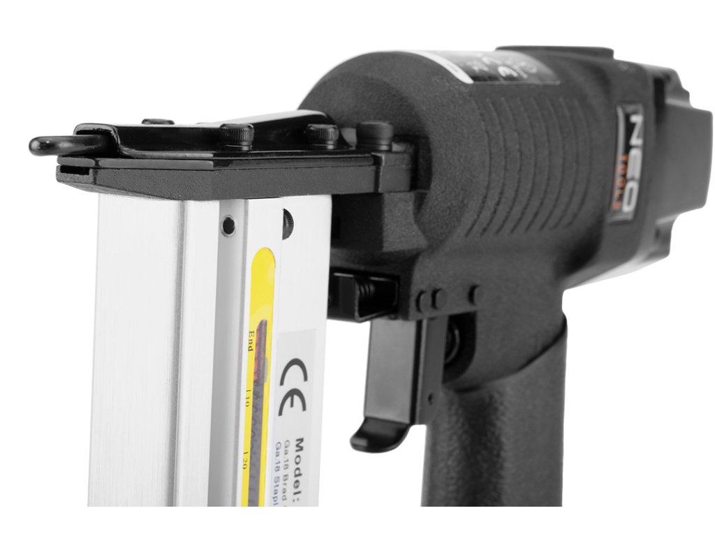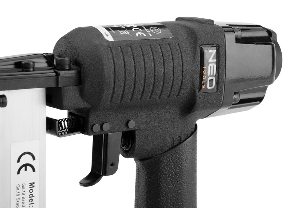Pneumatická sponkovačka NEO (ref.14-570) je určena pro všechny druhy čalounických a truhlářských prací. Je to robustní a univerzální nástroj vhodný pro zatloukání sponek a hřebíků různých velikostí. sponek typu 90 (délka od 16 do 40 mm) a hřebíků typu 300 (délka od 15 do 50 mm). Sponkovačka má praktickou kapotáž, pomocí které lze měnit směr výstupu stlačeného vzduchu. To usnadňuje práci například v nepohodlné poloze nebo na obtížně přístupném místě. Souprava se dodává s bezpečnostními brýlemi, jedním zásobníkem hřebíků, jedním zásobníkem sponek, olejem a imbusovým klíčem. Celé nářadí je uloženo v praktickém kufříku pro přenášení. Soulad s evropskými bezpečnostními normami zajišťuje certifikát CE. Značka NEO splňuje očekávání profesionálů.