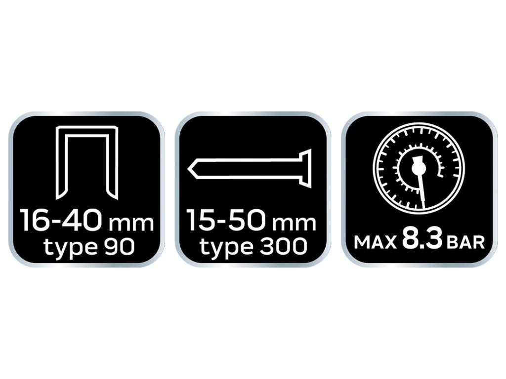 Pneumatická sponkovačka, sponky typ 90 (16–40 mm), hřebíky typ 300 (15–50 mm), pracovní tlak 5–8 barů, hmotnost 2 kg.