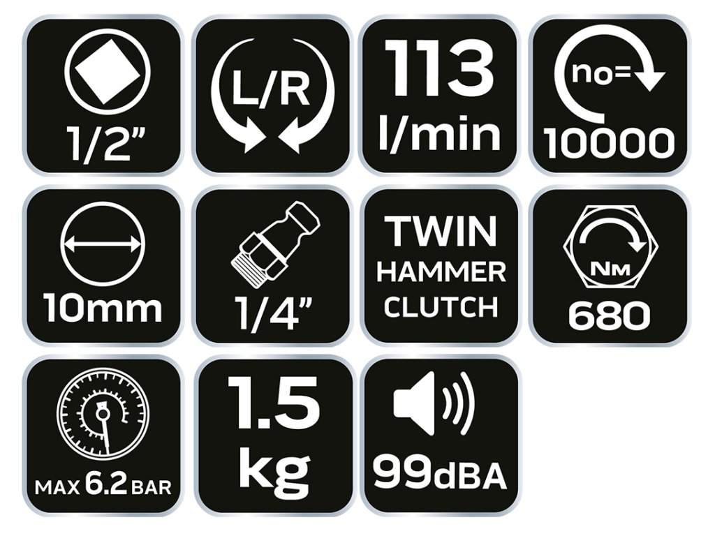 Pneumatický rázový utahovák, 1/2" NEO, profesionální nárazový klíč vyrobený z kompozitu je určen pro práci s velkými zatíženími. Nárazový systém s dvouspojkovým kladivem Twin Hammer, umožňuje dosáhnout maximálního točivého momentu v širokém rozsahu otáček. Má regulaci otáček vlevo/vpravo0 a nastavení krou Pohodlí při práci zvyšuje nemrznoucí rukojeť. Díky kompaktnímu designu a malým rozměrům je klíč je pohodlný při práci iv těžko přístupných místech Soulad s evropskými bezpečnostními normami dokládá certifikát CE.