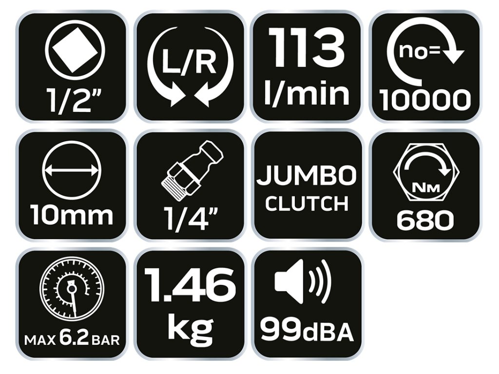Pneumatický rázový utahovák, 1/2" NEO, profesionální nárazový klíč vyrobený z kompozitu je určen pro práci s velkými zatíženími. Nárazový systém s dvouspojkovým kladivem Jumbo, umožňuje dosáhnout maximálního točivého momentu v širokém rozsahu otáček. Má regulaci otáček vlevo/vpravo0 a nastavení kroutí Pohodlí při práci zvyšuje nemrznoucí rukojeť. Díky kompaktnímu designu a malým rozměrům je klíč je pohodlný při práci iv těžko přístupných místech Soulad s evropskými bezpečnostními normami dokládá certifikát CE.