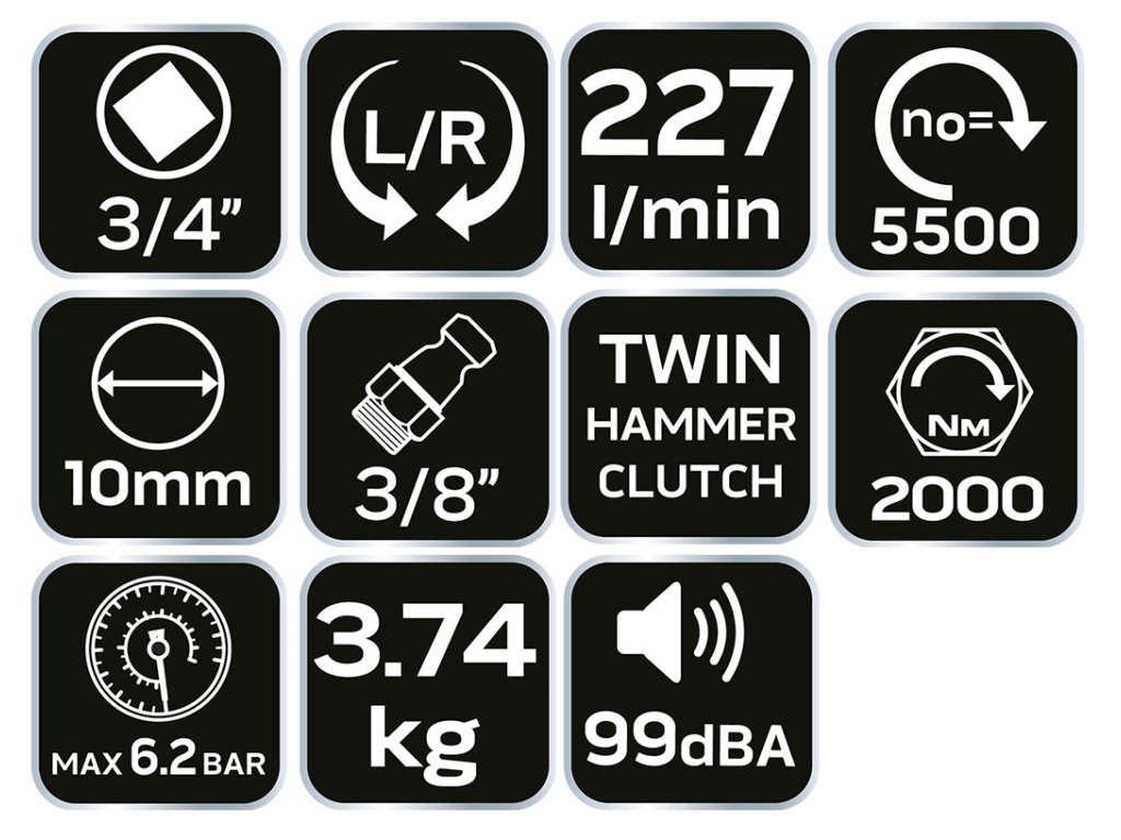 Pneumatický rázový utahovák, 3/4" NEO (ref. č. 12-024). Silný nárazový klíč určený pro práci s velkými zatíženími. Nárazový systém s trnovou spojkou Twin Hammers poskytuje vysokou rázovou pevnost do 2000Nm. Ideální např. nemrznoucí rukojeť. Soulad s evropskými bezpečnostními normami dokládá certifikát CE.