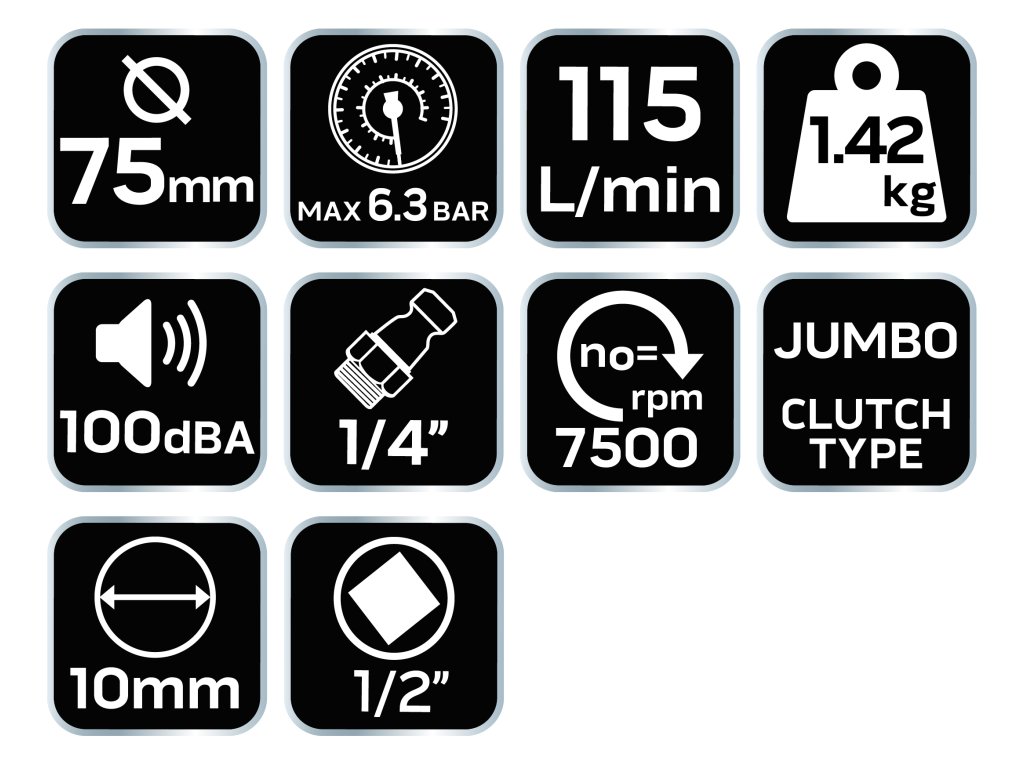 Úhlový rázový utahovák, 1/2", 500 Nm 14-019 od společnosti NEO je nástroj, který se vyznačuje točivým momentem 500 Nm. Pracuje při maximálním pracovním tlaku 6,3 bar s průměrnou spotřebou vzduchu 113 l/min. Klíč dosahuje rychlosti 750. praktický tvar přispívají k jeho pohodlí.