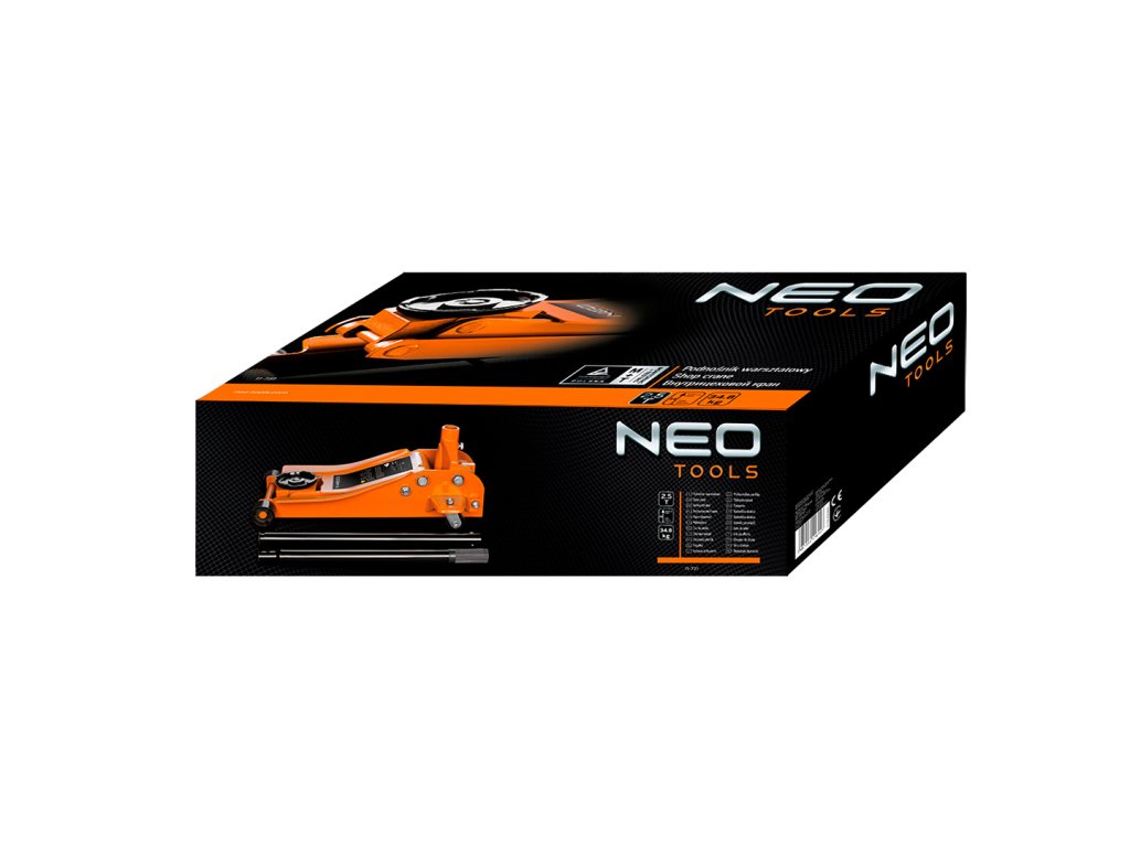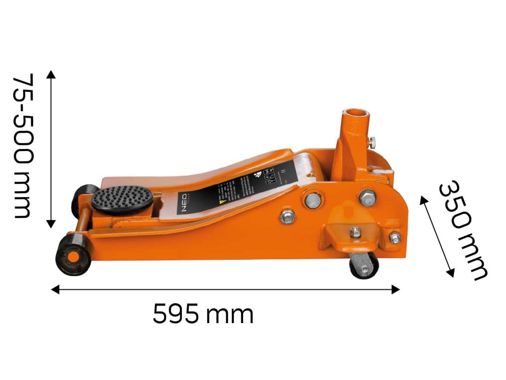 NEO hydraulický nízkoprofilový zvedák (ref. 11-731) žabí typ, má 2-otáčková kola pro snadné manévrování. Rozsah zdvihu 75 - 500 mm, maximální hmotnost 2,5t. Tento zvedák se vyznačuje speciálním profilem, který usnadňuje zvedání vozidel s nízkou světlou výškou. Certifikát CE zaručuje soulad s evropskými bezpečnostními normami. Certifikát TÜV Rheinland je zárukou vysoké kvality a spolehlivosti výrobku. Značka NEO splňuje očekávání profesionálů.