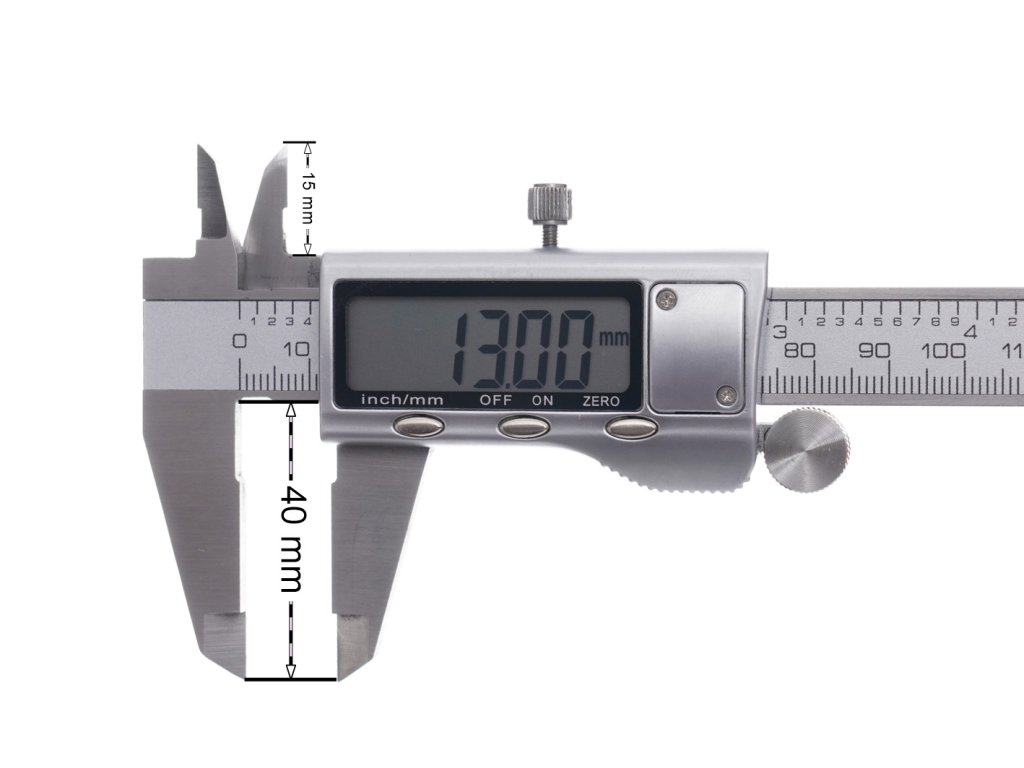 - Vnější a vnitřní měření, hloubka v mm nebo palcích