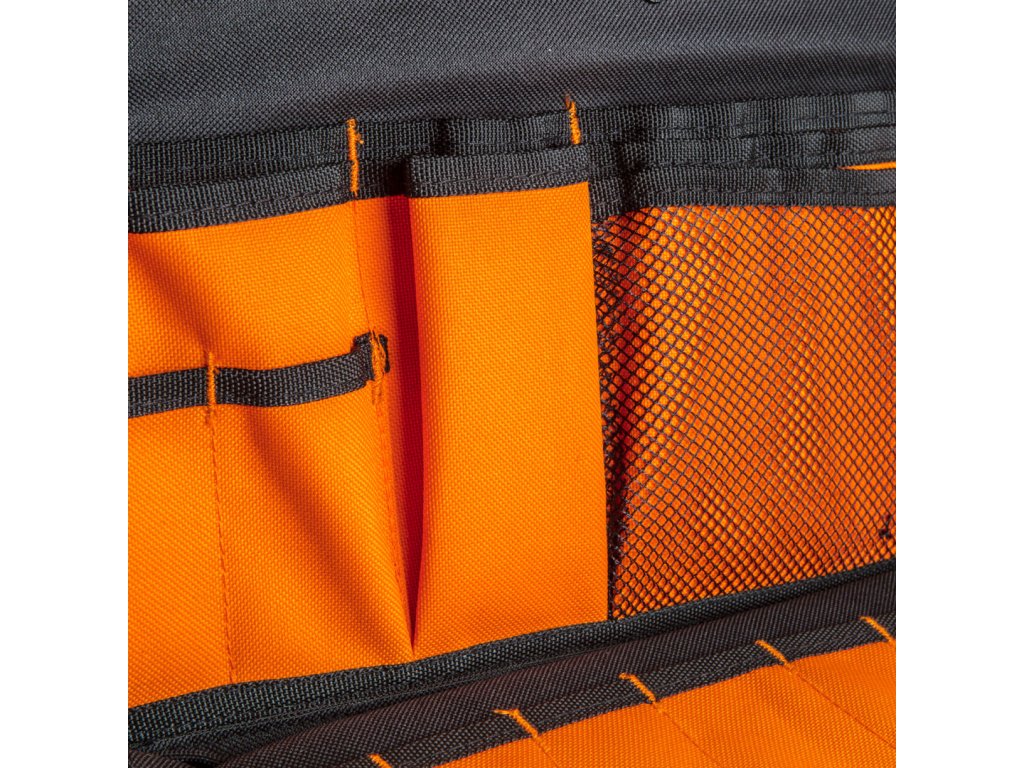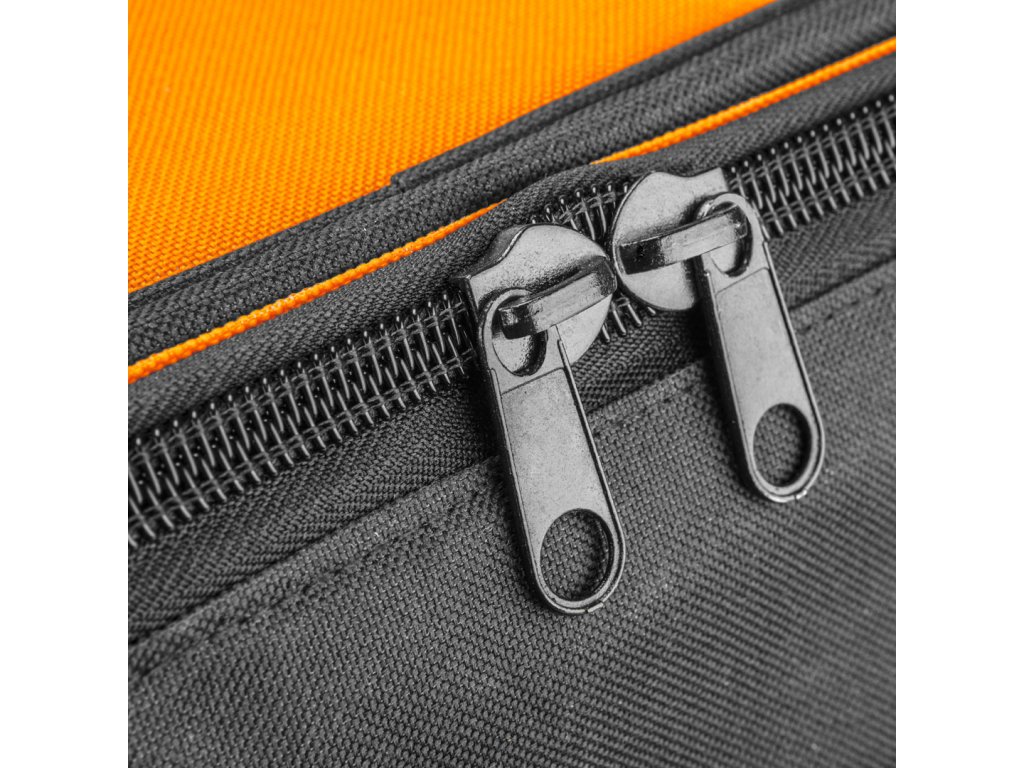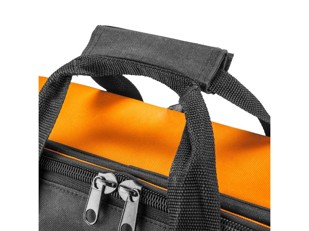 Montážní taška NEO (ref. Č. 84-308) vyrobena z polyesteru 600D, zaručujícího dlouholeté používání tašky. Má vyztužené dno se stojkami, které chrání obsah tašky v náročných podmínkách. Taška má mocné držadlo a pas na její přenášení. Její velkou výhodou je 17 vnitřních kapes, 2 vnější kapsy, v mnoha případech určených pro ruční nástroje usnadňující jejich skladování a přepravu. Značka NEO splňuje očekávání profesionálů.