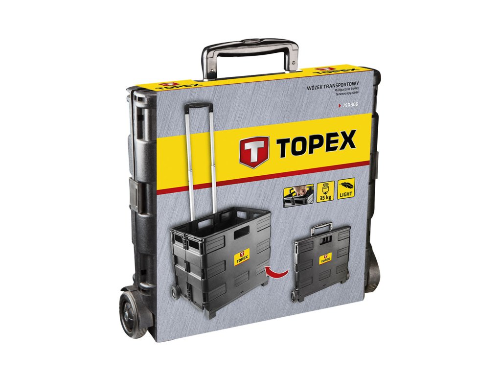 Přepravní vozík bedýnka TOPEX (ref. č. 79R306) o rozměrech 37 x 42 cm, je univerzální vozík, který vám umožní pohodlnou přepravu předmětů různých druhů o hmotnosti do 35 kg. Přídavné pásy vyztužují konstrukci, stačí je vyjmout ze dna bedničky a upevnit na vrchní části stěn. Po složení vozík zabírá málo místa, takže se dá uložit například. do kufru auta. Flexibilní nastavení pro uživatele pomocí teleskopické rukojeti nastavitelné ve 2 výškách.