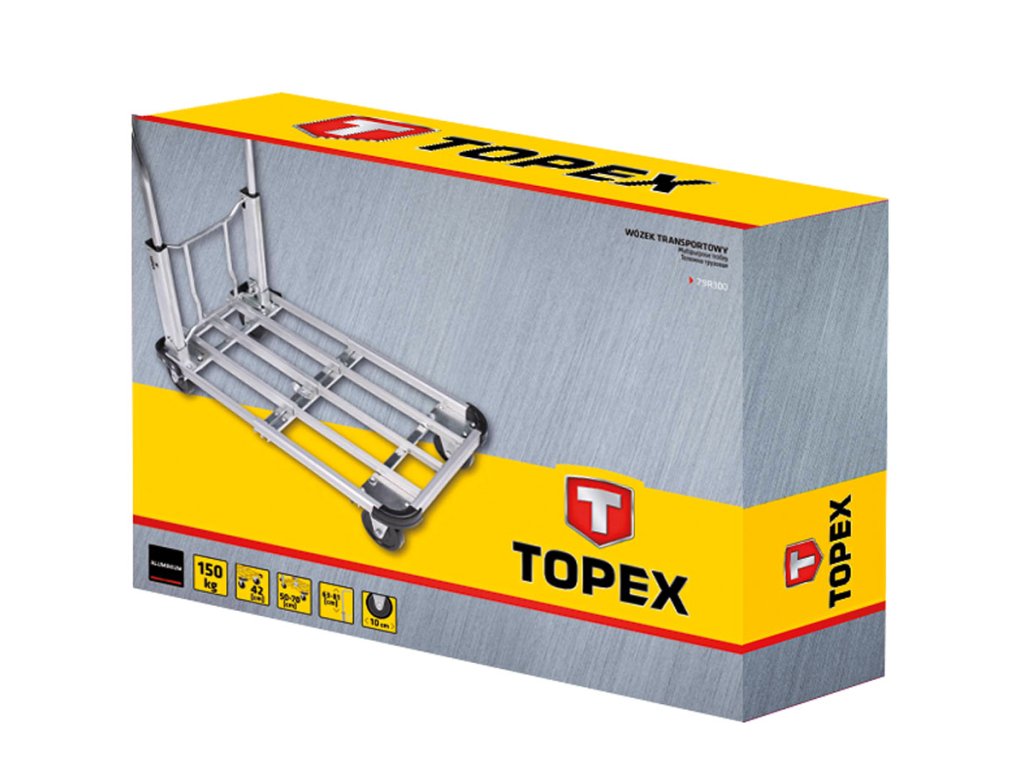 Skládací přepravní vozík TOPEX (ref. 79R300) o rozměrech 70 x 42 cm. Lehký a praktický přepravní vozík s nosností do 150 kg. Rukojeť je vyrobena z odolných hliníkových profilů a její výška je nastavitelná od 50 do 70 cm. Vozík je vybaven robustními koly a plastovými nárazníky. Díky možnosti složení je praktický při přepravě. Vozík váží 7,5 kg. Značka TOPEX je určena pro domácí kutily.