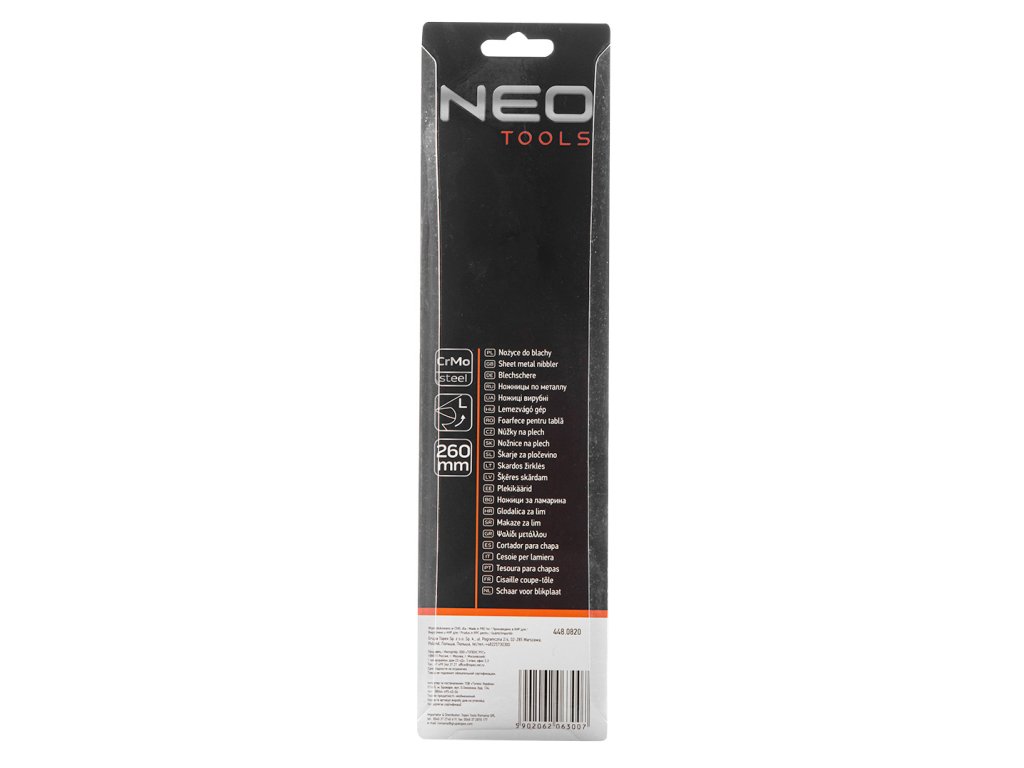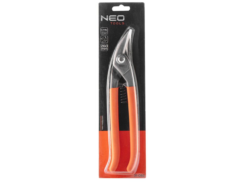 Nůžky na plech NEO, levé (ref. 31-082) o délce 260 mm jsou určeny pro pokrývačské a plechařské práce. Nůžky jsou vhodné pro rovné i zakřivené stříhání. Dokáží řezat ocelové plechy o maximální tloušťce 1,5 mm. Čepele jsou vyrobeny z kvalitní chrom-molybdenové oceli. Pogumované rukojeti na rukojeti zabraňují sklouznutí ruky.