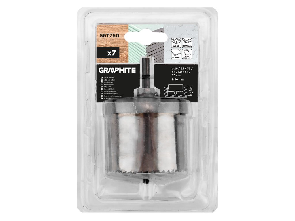Pily na dřevo 26 - 63 mm, h 50 mm, sada 7 kusů 56T750 od GRAPHITE je sada obsahující 7 kusů o průměrech: o průměrech 26, 32, 38, 45, 50 a 63 mm. Výška každé děrovačky je 50 mm a maximální hloubka vrtání je 42 mm. Maximální rychlost otáčení je 1500 otáček za minutu. Výrobek je určen k vrtání do dřeva, sádrokartonu a plastu.