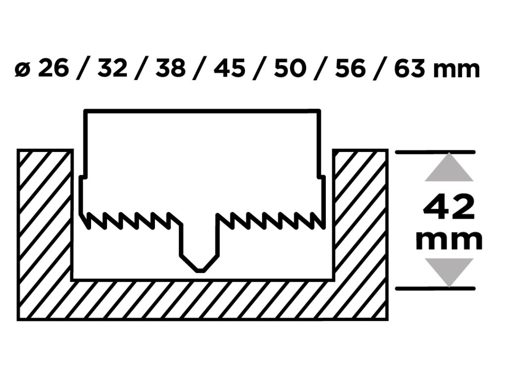Pily na dřevo 26 - 63 mm, v 50 mm, sada 7 ks: Hloubka vrtání 42 mm, max. 40 mm otáčky: 1500 ot/min, použití: dřevo, sádrokarton, plast