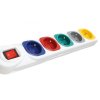 Prodlužovačka má 5 zásuvek, které jsou barevně odlišené, s centrálním vypínačem, jakož i s přepěťovou ochranou.