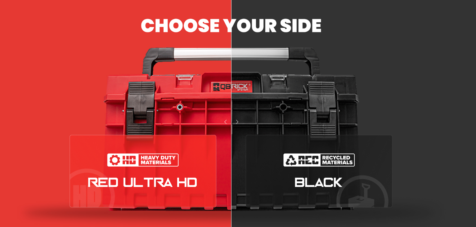 Červená řada Qbrick (Red Ultra HD) : extrémně odolný polypropylen s vysokou mechanickou a chemickou odolností - když potřebuješ maximální pevnost, spolehlivost v extrémech a ochranu nářadí.