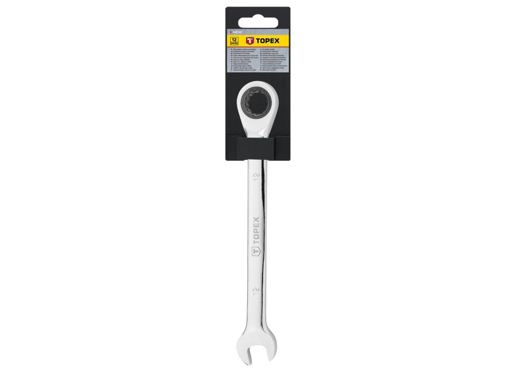 kombinovaný klíč TOPEX s ráčnou (ref. 35D747) velikosti 12 mm se vyznačuje přesným 48 zubovým ráčnovým mechanismem použitým v očku. Toto řešení rozhodně usnadňuje a urychluje práci. Vyrobeno z kvalitní chrom-vanadiové oceli, která zaručuje dlouhou životnost klíče. Značka TOPEX je určena pro domácí kutily.