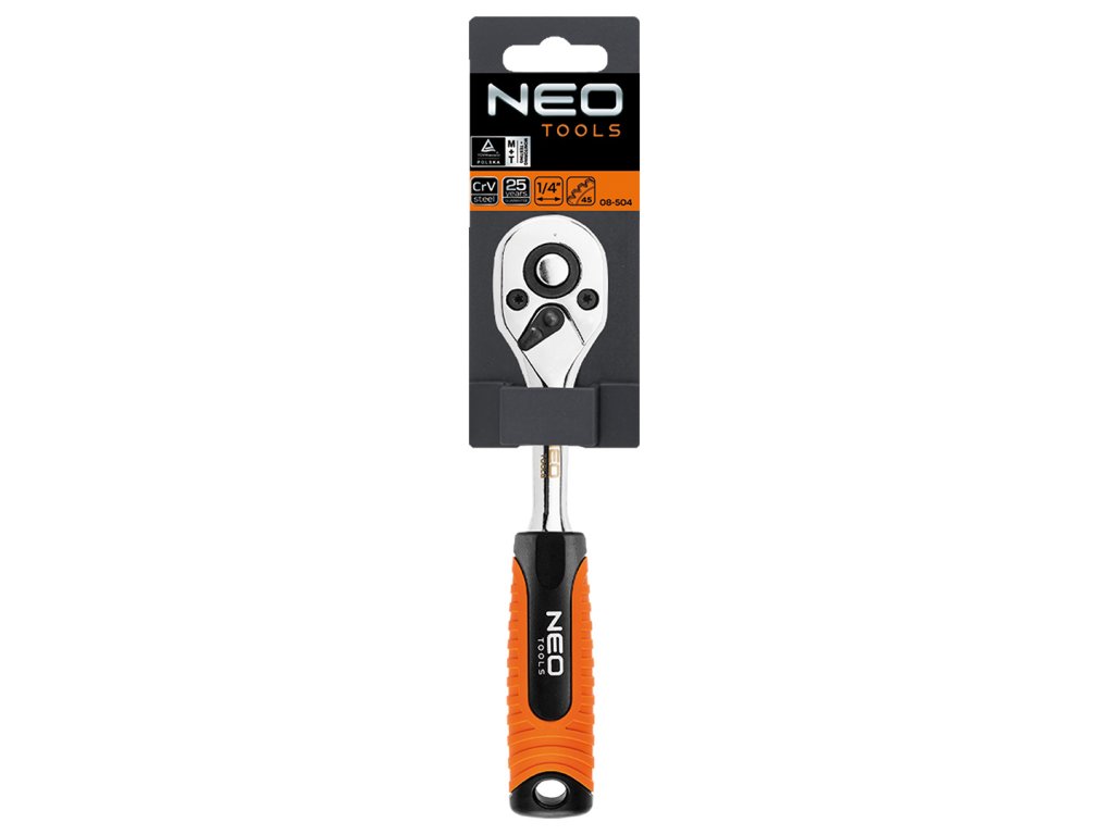 NEO 1/4" ráčna (ref. 08-504), 150 mm dlouhá, s tělem z chrom-vanadiové oceli, vyrobena dle normy DIN 3122. 45-zubový ráčnový mechanismus je vyroben z mimořádně odolné chrom-molybdenové oceli, což je přední materiál. zvyšuje pohodlí při práci. Kvalita nářadí potvrzená certifikátem TÜV.