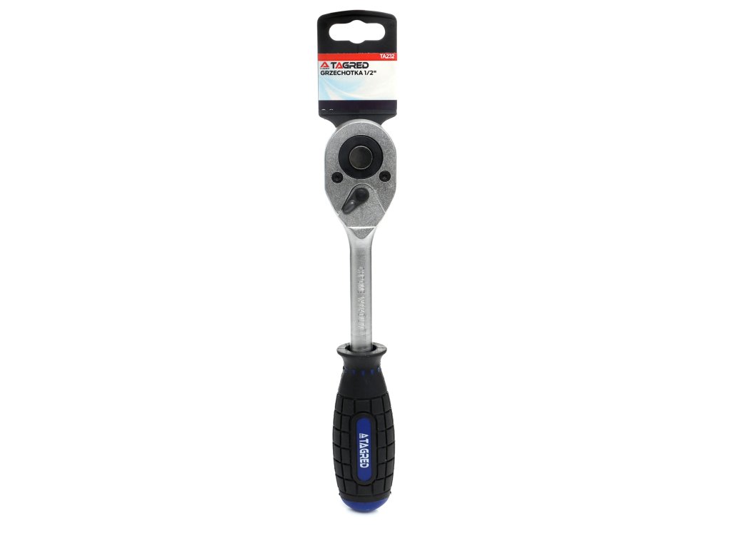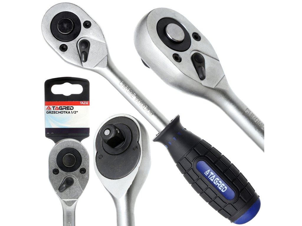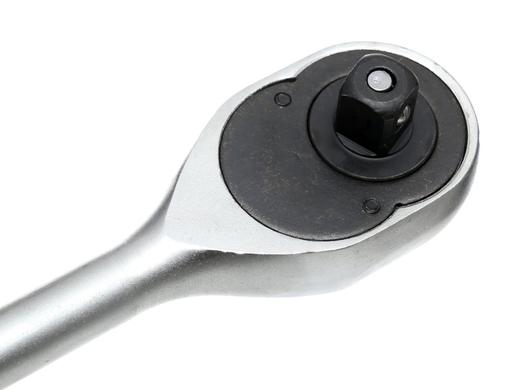Robustní ráčna 1/2" vyrobená z oceli CrV (chrom-vanádová), která zaručuje její odolnost a odolnost proti poškození. Násadový klíč má mechanismus s 24 silnými zuby, který přenáší velký moment na čtyřúhelník, přepínač otáčení P/L umístěný.