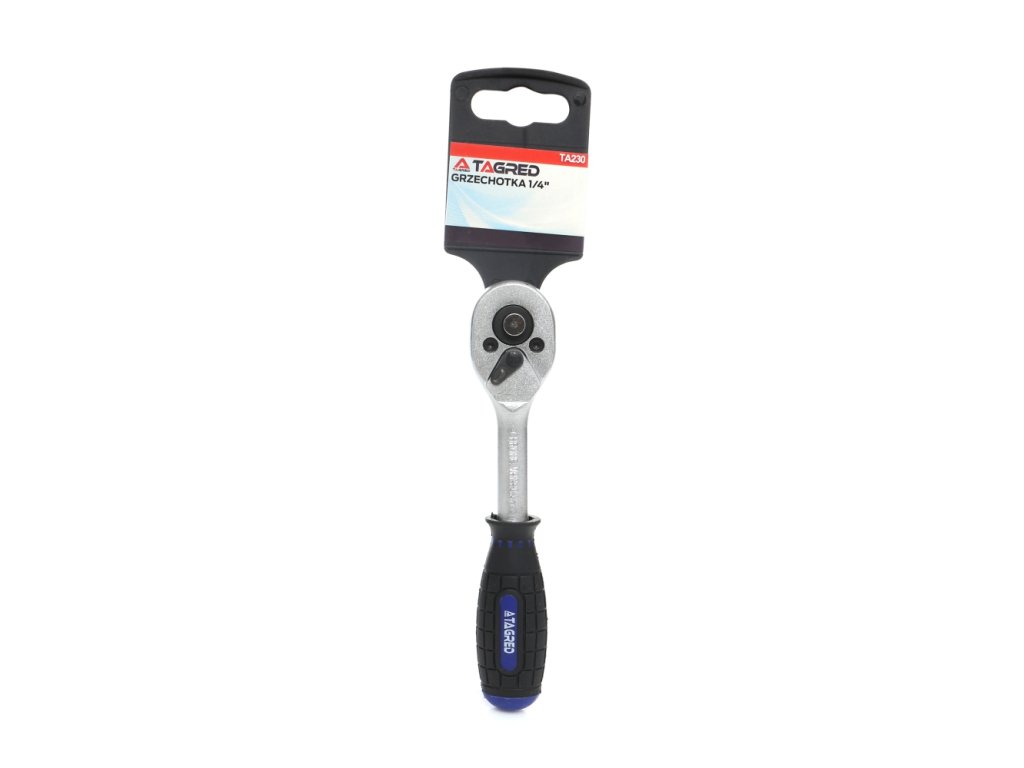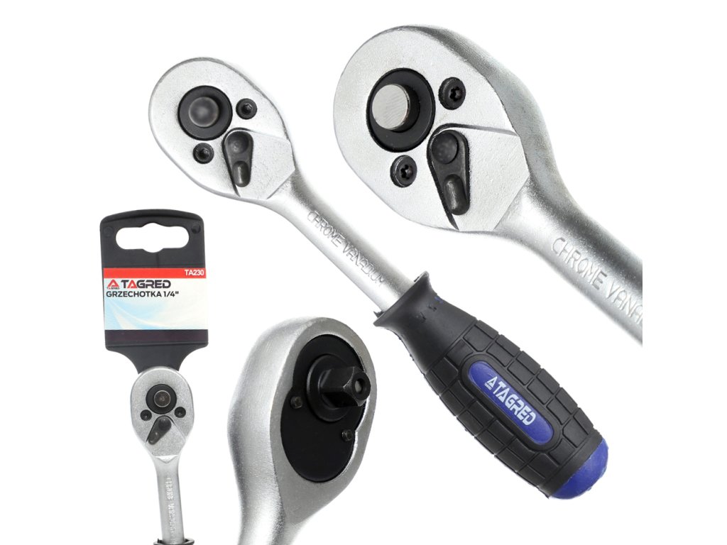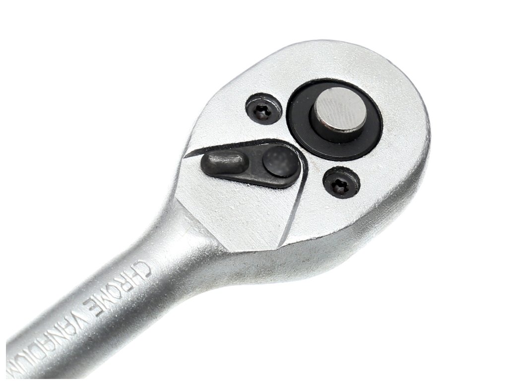 Robustní ráčna 1/4" vyrobená z oceli CrV (chrom-vanádová), která zaručuje její odolnost a odolnost proti poškození. Nástrčný klíč má mechanismus s 24 silnými zuby, který přenáší velký točivý moment na čtvercový profil, přepínač otáčení klíče. Vroubkovaná rukojeť ráčňového klíče vyrobená z vysoce kvalitního materiálu zajišťuje jistý a pevný úchop ráčňového klíče! a co je nejdůležitější, usnadňuje udržování čistoty.