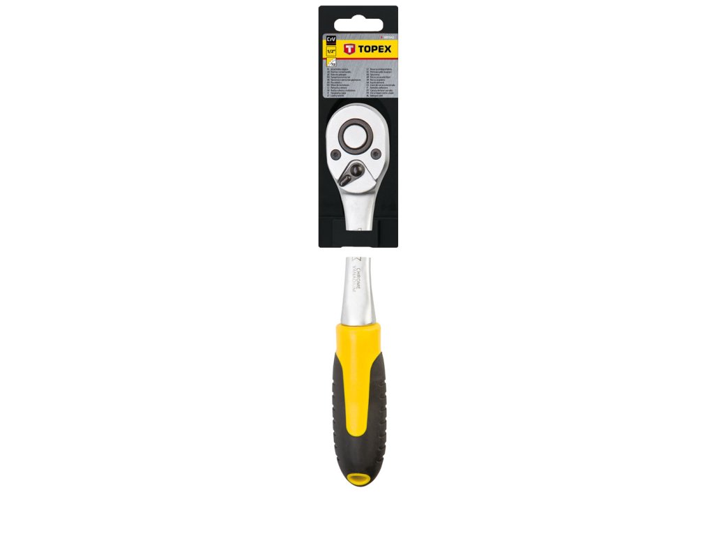 TOPEX 1/2" ráčna (ref. 38D542) o délce 255 mm. Vyrobeno z kvalitní chrom-vanadové oceli, která zaručuje dlouhou životnost výrobku. Račnový mechanismus se 72 zuby umožňuje přesnou práci. Ergonomická plastová rukojeť s protiskluzovým materiálem pro bezpečnost. 3122 jsou zárukou spolehlivosti výrobku.
