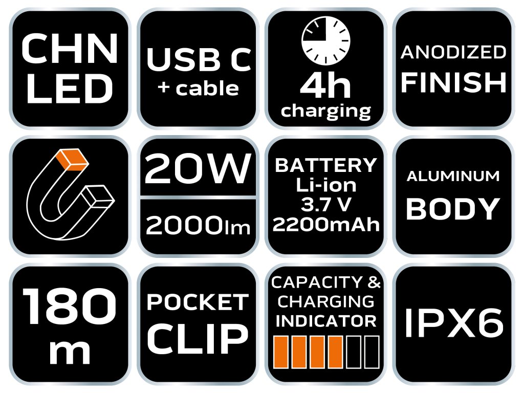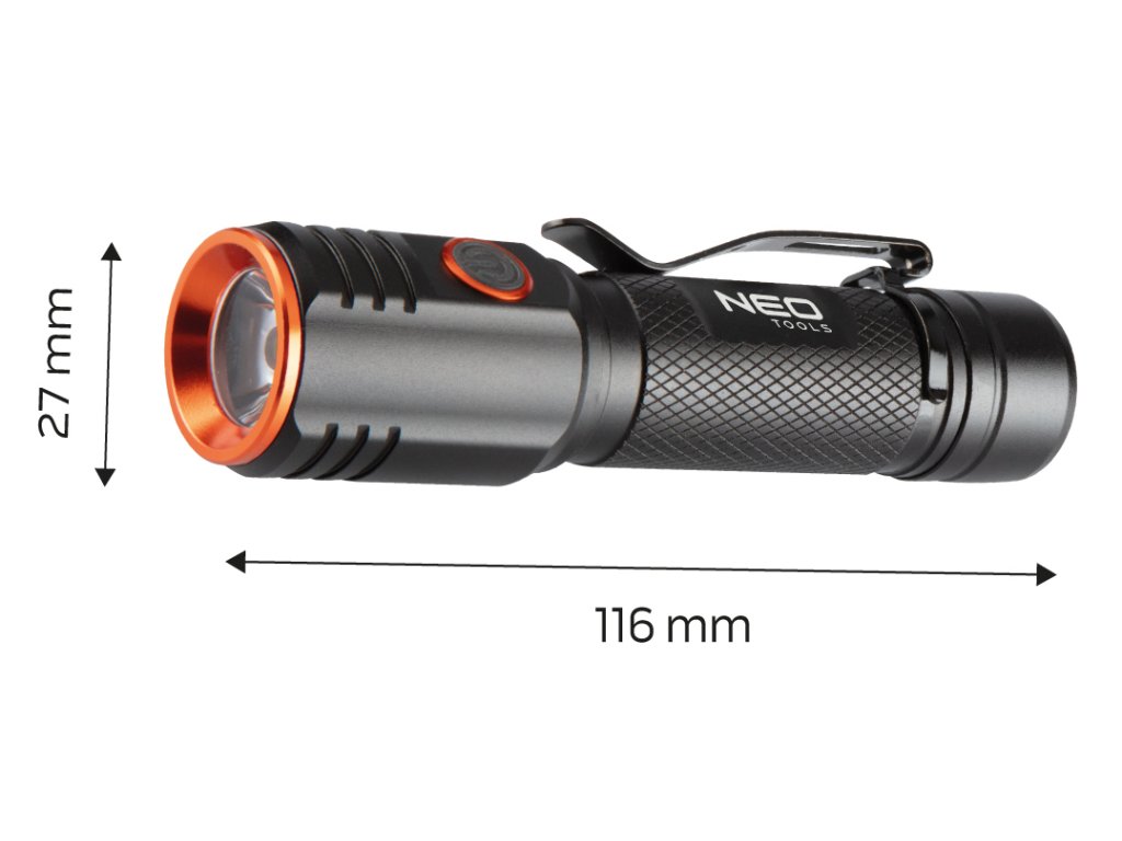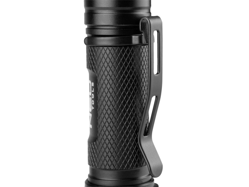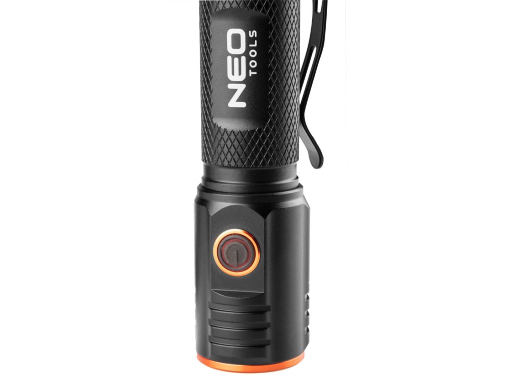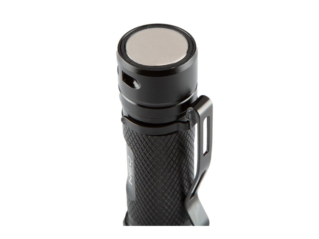 Akumulátorová baterka NEO (ref. 99-067) je vybavena LED diodou CHN se světelným tokem 2000 lumenů a výkonem 20 W. Má 5 světelných režimů: 100% (pracovní čas max. 20 sekund), 30%, 10%, 10%, 10%, 10% Napájí se z 3,7V Li-Ion baterie s kapacitou 2200 mAh, která je součástí balení. Baterka má indikátor nabití baterie. Svítilna má maximální dobu hoření až 4 hodiny a dosah hoření 180m. Svítilnu lze snadno připnout na kapsu díky klipu nebo připevnit pomocí magnetu.