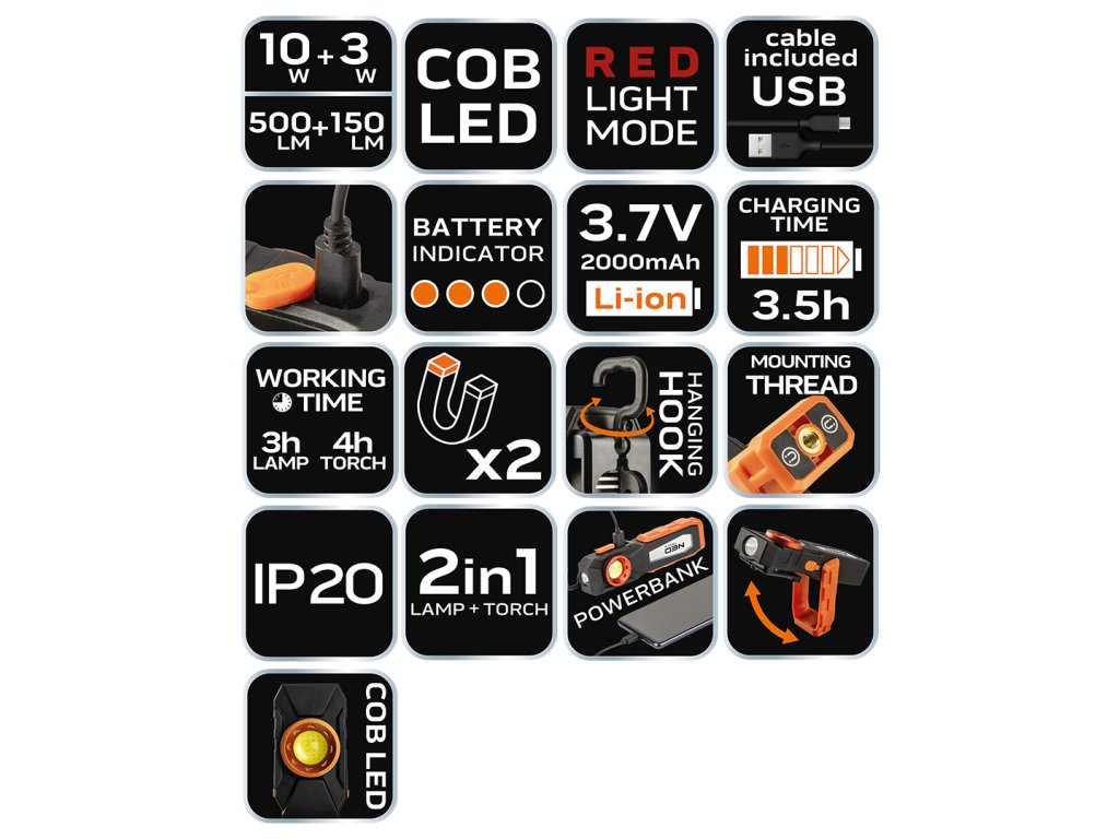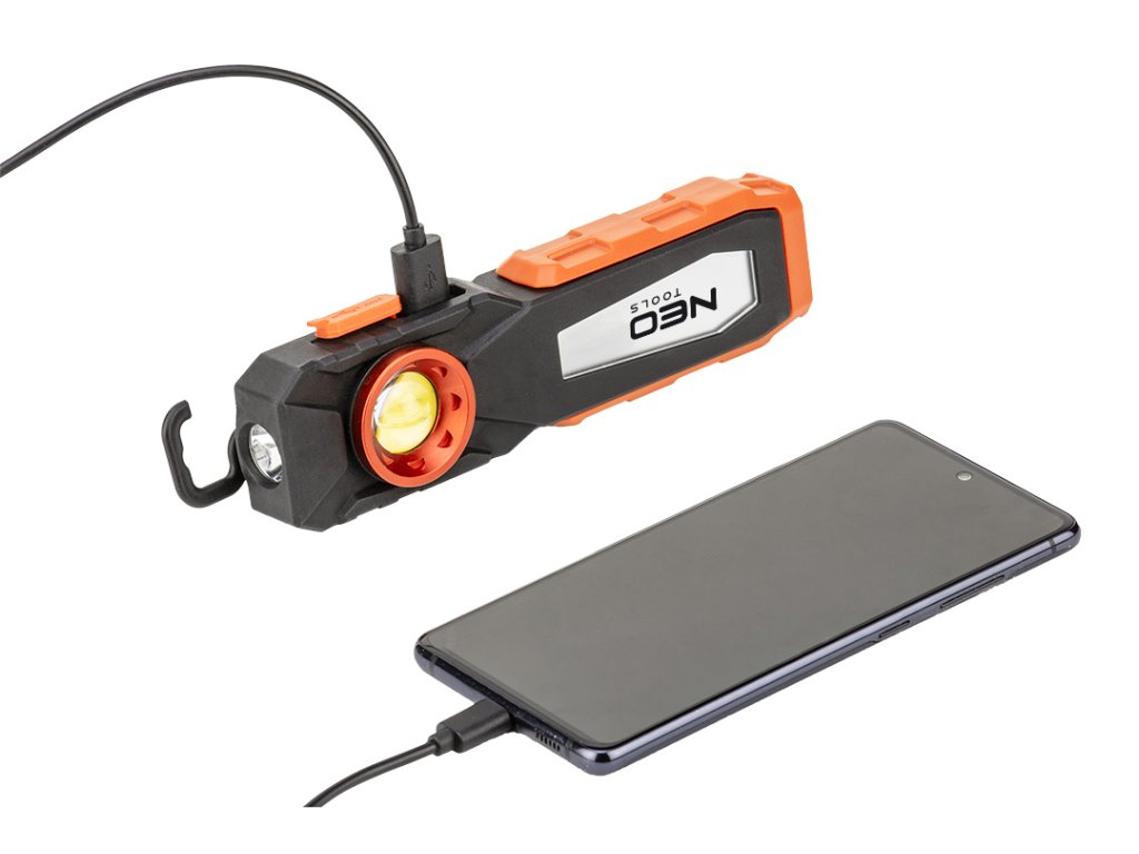 Dílenská lampa COB LED 99-072 o výkonu 500 lm od společnosti NEO je praktické přenosné zařízení 2 v 1. Nabízí dílenskou lampu (500 lm 10 W) a baterku (150 lm 3 W) v sadě s užitečným příslušenstvím. Výrobek má indikátor nabíjení baterie, funkci powerbanky, možnost červeného světla, jakož i otočnou základnu a montážní zásuvku pro stativ. Svítilna je napájena lithium-iontovou baterií 3,7 V s kapacitou 2000 mAh. Plný nabíjecí cyklus trvá přibližně 3,5 hodiny, po kterém může zařízení nepřetržitě svítit 180 minut (jako svítilna) nebo 4 hodiny (jako baterka). Souprava obsahuje: 2 magnety, montážní háček a kabel USB, pomocí kterého můžete nabíjet i svůj telefon. Lampa 2 v 1 se doporučuje do každé dílny, garáže a zahrady.