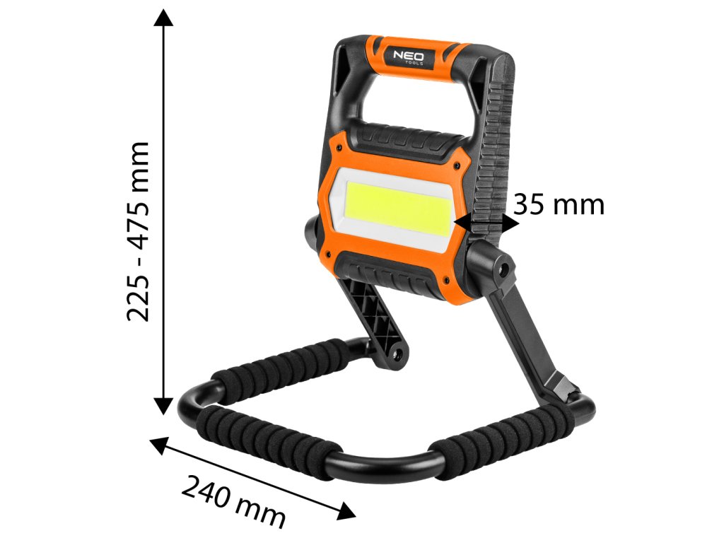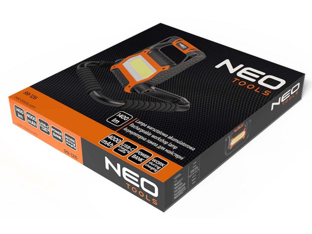Dobíjecí dílenská lampa 99-126 s výkonem 1400 lm od společnosti NEO TOOLS je bezdrátová lampa napájená baterií o kapacitě 4000 mAh. Je vybavena LED diodami COB a nabízí možnost svítit 2 až 4 hodiny. Díky praktickému nastavení úhlu světelného paprsku umožňuje vhodně umístit zařízení vzhledem k vykonávané úloze. Úplné nabití trvá 4,5 hodiny (kabel USB je součástí balení). Může pracovat během nabíjení. Dílenská lampa má funkci powerbanky. Vhodná pro cestování díky skládacímu designu a kompaktnosti pro přepravu.