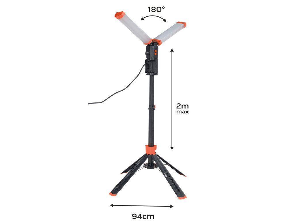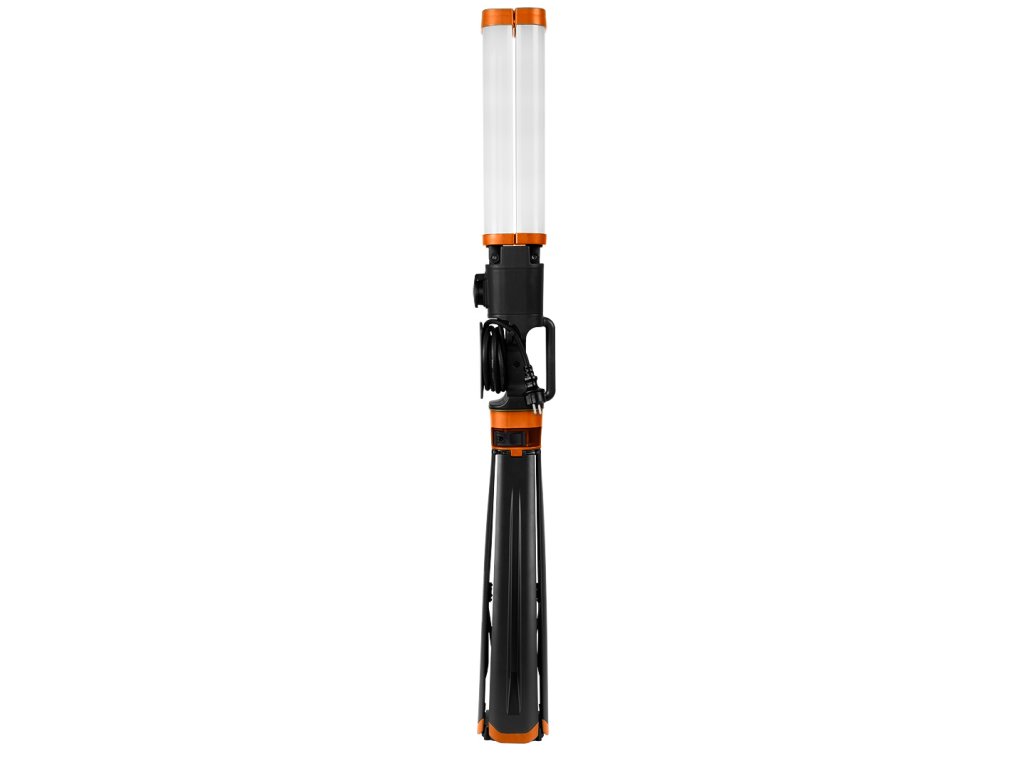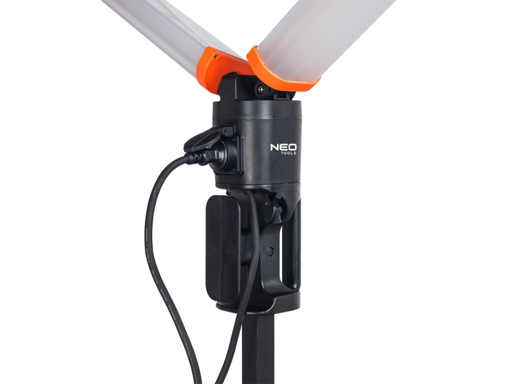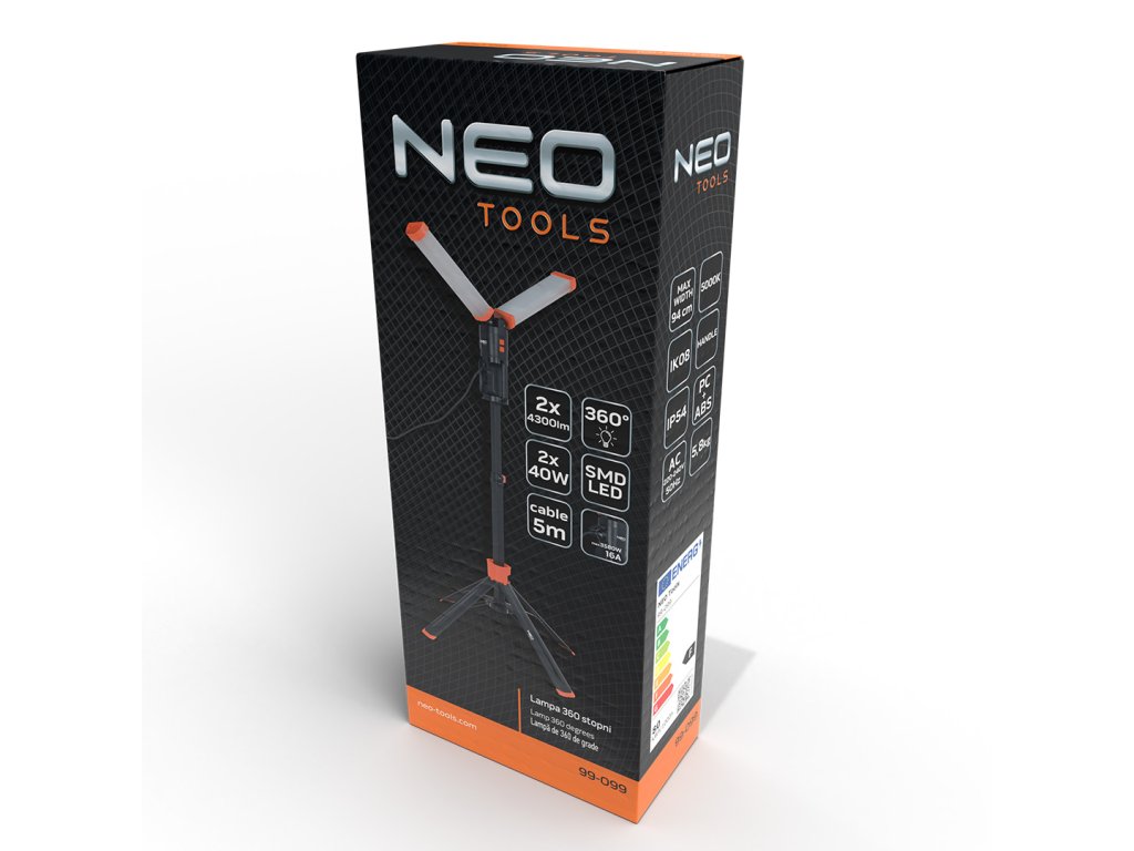360stupňová dvojitá lampa 2 x 4300 lm 99-099 od společnosti NEO o výkonu 2x 40 W má skládací design do maximální výšky 2 ma šířky 94 cm. Má maximálně 180stupňové rozložení světla. Zařízení je vybaveno elektrickou zásuvkou pro maximální odběr 3580 W 16 A. Má barvu světla 5000 K a napájení střídavým proudem 220 - 240 V 50 Hz. Je možné zapnout pouze 1 žárovku. Světlo je intenzivní, ale ne oslňující, a proto přispívá k vysoké úrovni pracovního komfortu. Lampa má 5 m kabel, rukojeť pro přenášení a magnety v základně a lampách pro snadnou přepravu. Hmotnost zařízení je jen 5,8 kg. Tělo je vyrobeno z ABS a má stupeň vodotěsnosti IP 54, jakož i odolnost proti pádu a rozdrcení IK08. Dvojitá lampa NEO se doporučuje pro domácí kutily a stavitele.
