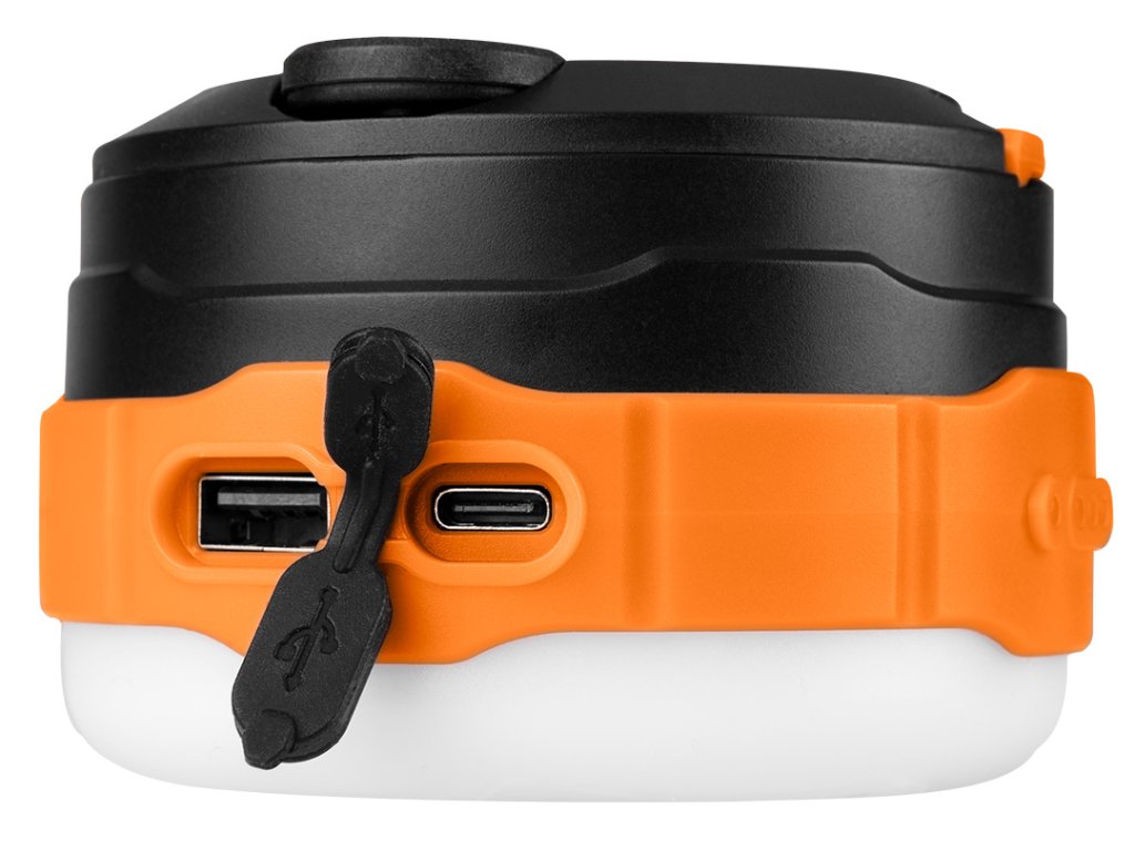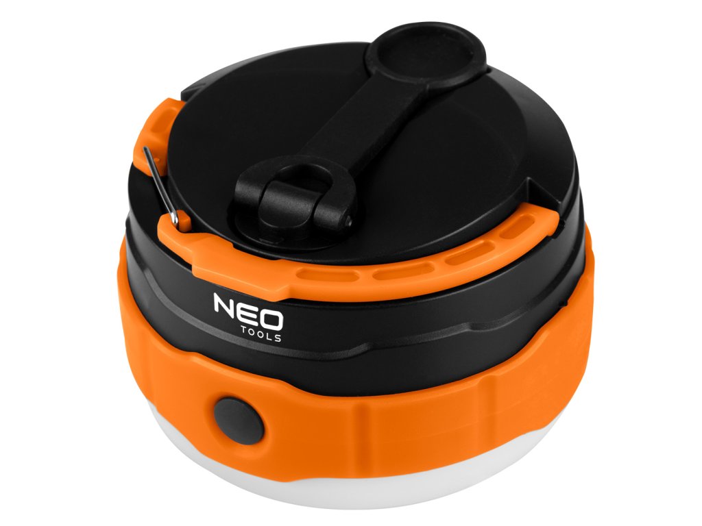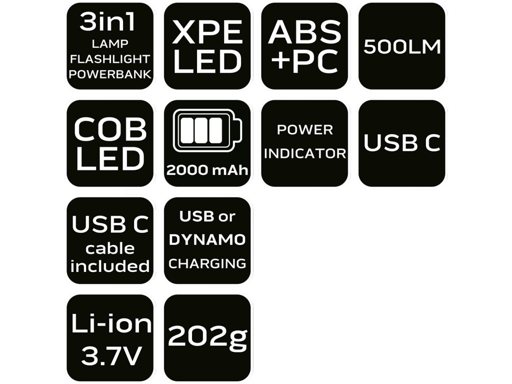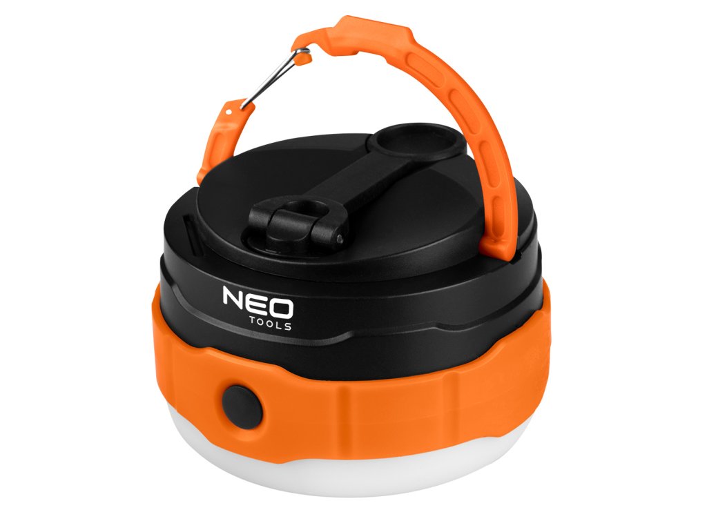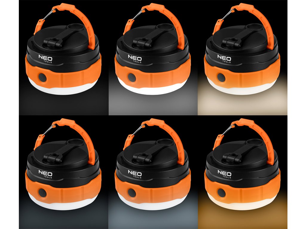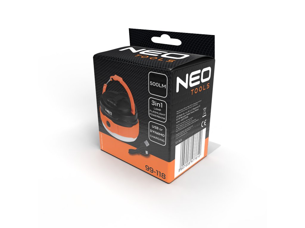 Powerbank + dynamo 3 v 1 SMD LED kempová lampa 99-118 od společnosti NEO TOOLS je víceúčelové zařízení 3 v 1, které v sobě spojuje funkci lampy, baterky a powerbanky. Vyznačuje se jasem až 500 lumenů. Je vybavena výkonnými LED diodami SMD+XPE a Li-ion baterií 18650 s kapacitou 3,7 V a 2000 mAh. Kempová lampa je vyrobena z odolného materiálu ABS+PC. Má kompaktní rozměry 89 x 57,7 mm a váží pouhých 202 g. Díky funkci powerbanky lze přes ni nabíjet jiná zařízení prostřednictvím kabelu USB C, který je součástí soupravy. Svítilna má možnost manuálního dodatečného nabíjení dynamem. Indikátor nabití baterie a indikátor nabíjení umožňují kontrolovat proces dobíjení. Čas nabíjení do plného stavu ze sítě je 2,5 h. Díky háku/držáku na zavěšení lze lampu volně umístit, např. ve stanu na kempování. Svítilna 3 v 1 NEO TOOLS se vyznačuje možností nastavení různých intenzit světla: nízký režim svítidla 70 lumenů/9 hodin, vysoký režim svítidla 500 lumenů/1 hodina, nízký režim baterky 60 lumenů/10,5 hodiny, vysoký režim baterky 11. Kromě toho má funkci červeného světla (dvojklik) + červený stroboskop. Jedná se o všestranné zařízení pro mnohostranné použití.