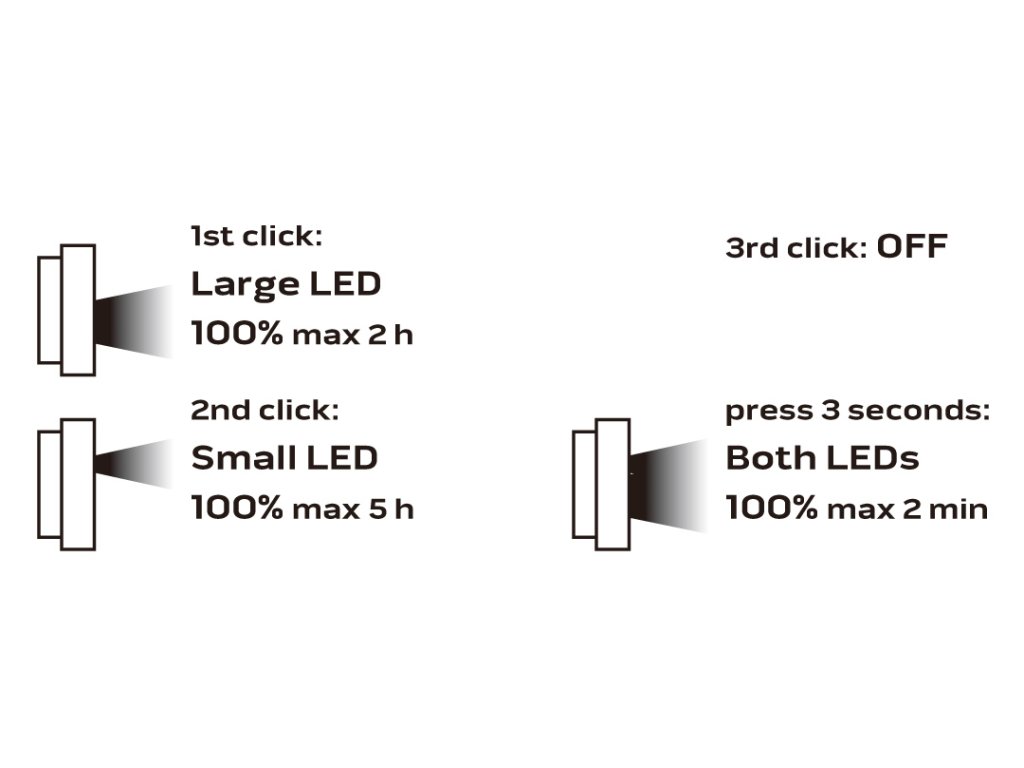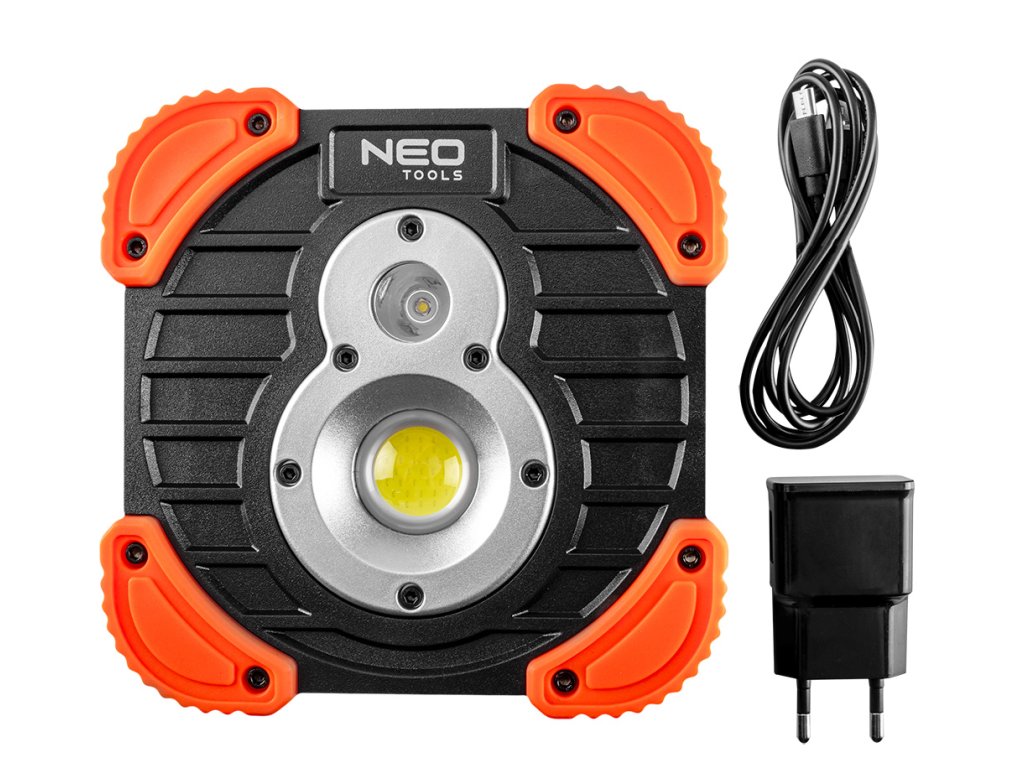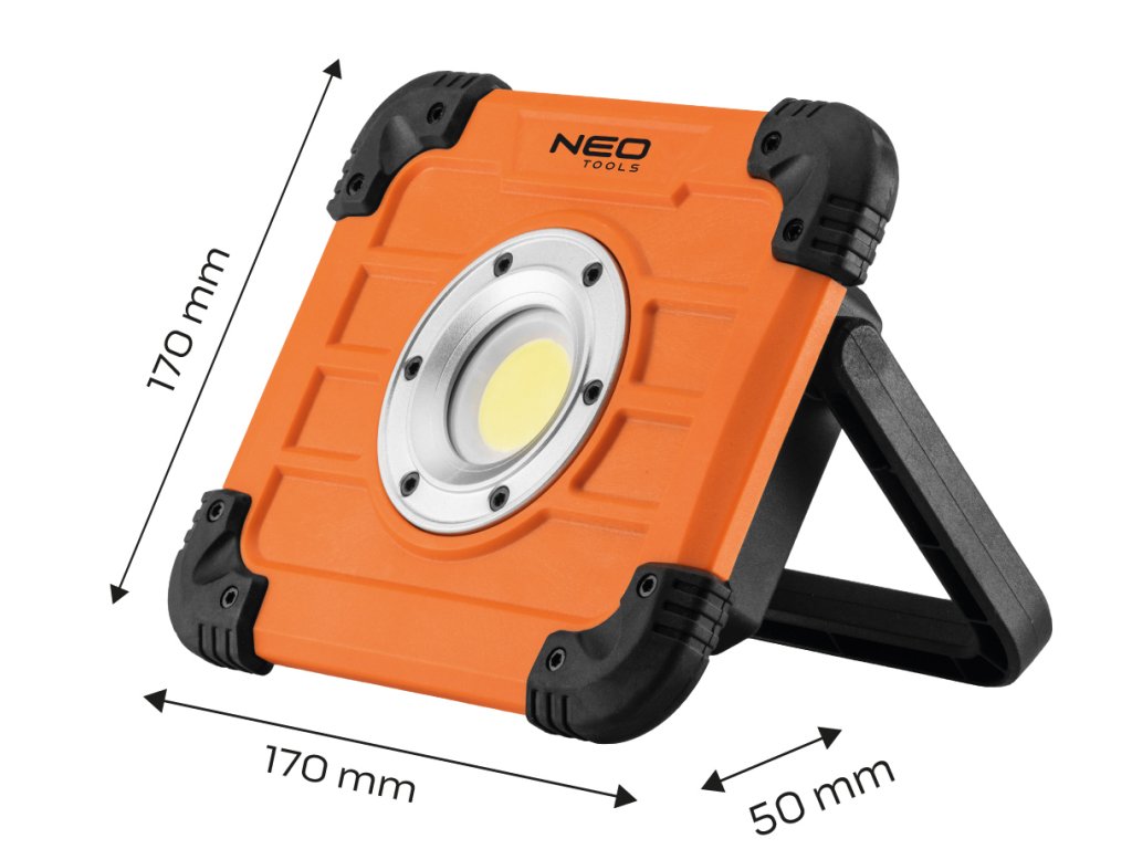 Baterkový reflektor NEO je vybaven LED diodami COB a CREE XPG se svítivostí 750 a 250 lumenů a výkonem 10 W a 3 W. Světlomet je napájen přiloženou 3,7 V Li-Ion baterií o kapacitě 2600 mAh. Svítilna má 3 funkce světla: velké LED, malé LED a kombinované. Úhel sklonu lze nastavit. Soulad s evropskými bezpečnostními normami potvrzuje certifikát CE.