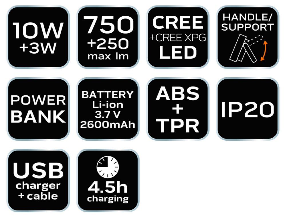 Neo baterkový reflektor 10W + 3W, 750+250 lumenů, LED CREE XPG + COB, powerbanka, napájení 2600mAh 3.7 Li-ion (součástí balení), nabíječka 5V/1A (součástí balení), IP44, materiál rukojeť/opěrka, 3 světelné funkce malá lampa, velká lampa, dvě lampy najednou (max. 2min), pracovní doba 5h, čas nabíjení 4,5h.