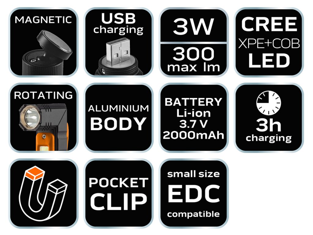 USB dobíjecí baterka 300 lm 2 v 1 CREE XPE + COB LED 99-034