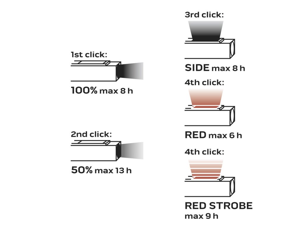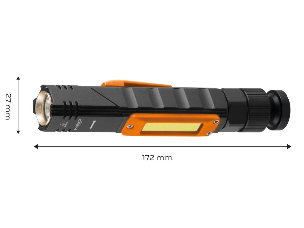 Nabíjecí baterka NEO (ref. 99-034) je produkt 2 v 1. Je vybavena moderní LED CREE XPE a COB LED se světelným tokem 300 lumenů a výkonem 3 W. Maximální dosah je 70m. Baterka je napájena přiloženou 3,7V Li-Ion baterií s kapacitou 2000 mAh. Baterka má 5 světelných funkcí: 100%, baterka 50%, boční světlo 100%, boční světlo červené a boční světlo červený stroboskop. Konstrukce hlavy otočné o 180 stupňů a magnet v základně zvyšují funkčnost baterky. USB kabel je součástí dodávky.