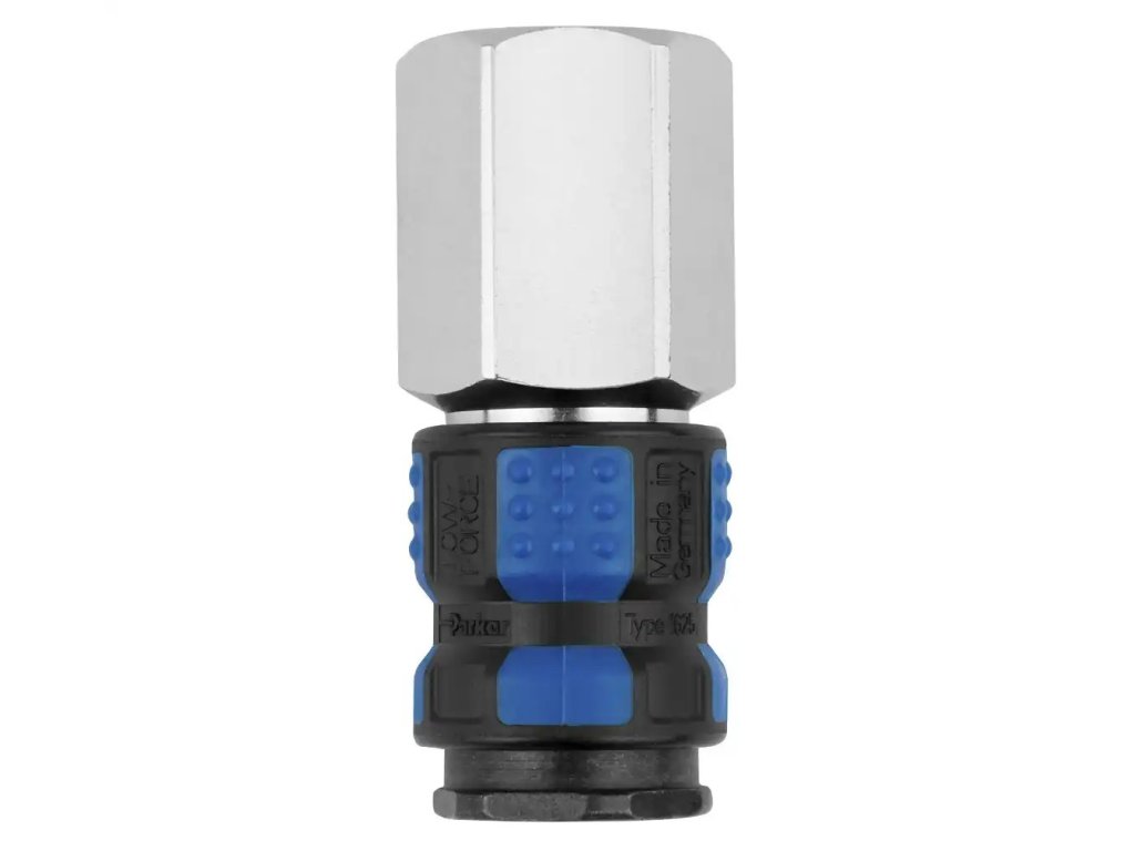 Performance: 2020 l/min Diametr: DN 7.8 / 48 mm2 Length: 68 mm Type of connection: female thread Size of thread: 1/2" Working Pressure: 0-35 bar Operační Temperature: -20 Body:Steel with QPQ coating Threaded Part:Nickel-plated brass Sleeve:TPE thermoplastic Valve:Brass Spring:AISI 301 stainless steel Locking Pins: AI Seal: NBR